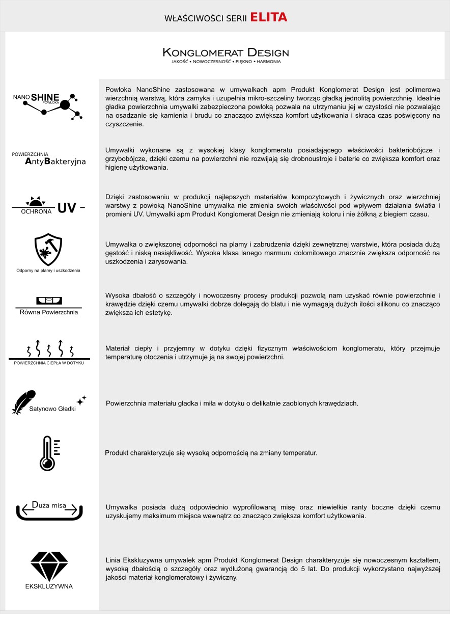 APM конгломерат конгломерат Washbasins Продукт Konglomerat Дизайн характеризуется высоким качеством используемых материалов, вниманием к деталям и привлекательной ценой. Все модели, которые мы предлагаем, были произведены в Польше. Раковины имеют гигиенический сертификат