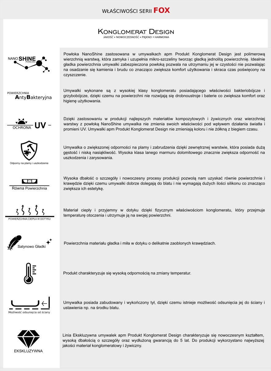 Для производства линии APM Exclusive использовался конгломерат и смолы высочайшего качества. Умывальники Konglomerat Design очень прочные и устойчивые к царапинам, что делает их идеальными для повседневного использования. Умывальники предназначены для установки на столешницу или шкаф в заранее подготовленное отверстие. Умывальник имеет встроенный глянцевый хромированный перелив, расположенный посередине задней стенки чаши. Отверстие под смеситель диаметром 3,5 см и сифон 4,5 см, стандартизированные для соответствия 99% сифонов и кранов, доступных на польском рынке.