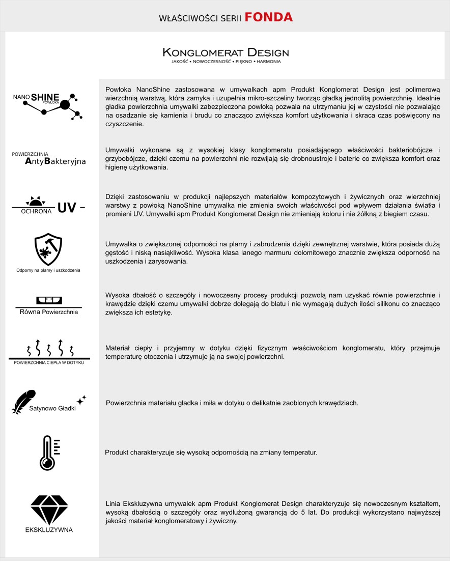 Для изготовления использовался конгломерат и смолы высочайшего качества. эксклюзивная линия умывальников APM Product Konglomerat Design. Раковины очень прочные и устойчивые к царапинам, что делает их идеальными для повседневного использования. Умывальники предназначены для установки на столешницу или шкаф в заранее подготовленное отверстие. Умывальник имеет встроенный глянцевый хромированный перелив, расположенный посередине задней стенки чаши. Отверстие под смеситель диаметром 3,5 см и сифон 4,5 см, стандартизированные для соответствия 99% сифонов и кранов, доступных на польском рынке.