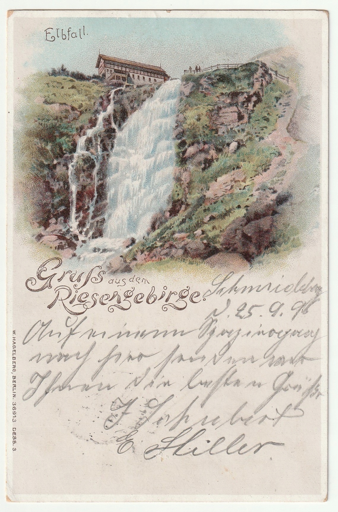 ЭЛЬБСКИЙ ВОДОПАД. Elbfall, Gruss aus den Reisengebirge. Марка от 26.09. 1898 г. В. Хагельберг. Состояние очень хорошее. Выведен из обращения.