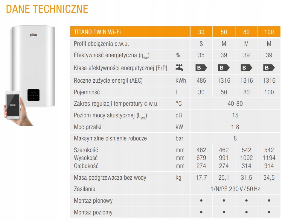 TITANO TWIN Wi-Fi — емкостные водонагреватели. отличается современным плоским корпусом, приспособленным для вертикальной или горизонтальной установки. Устройства имеют 2 независимых бака, обеспечивающих высочайший комфорт горячей воды, которые для большей долговечности покрыты специальным эмалевым покрытием с силиконом. Нагреватели оснащены ТЭНом мощностью 1,8 кВт по технологии BLUE FOREVER, а также 2 антикоррозионными магниевыми анодами, по одному на бак. TITANO TWIN Wi-Fi оснащен современной системой управления SMART с интеллектуальной системой управления энергопотреблением в соответствии с привычками пользователя. Он обеспечивает снижение энергопотребления до 20 % и простоту управления с помощью сенсорной панели управления или мобильных устройств и приложения EGEA SMART через домашнюю сеть Wi-Fi.