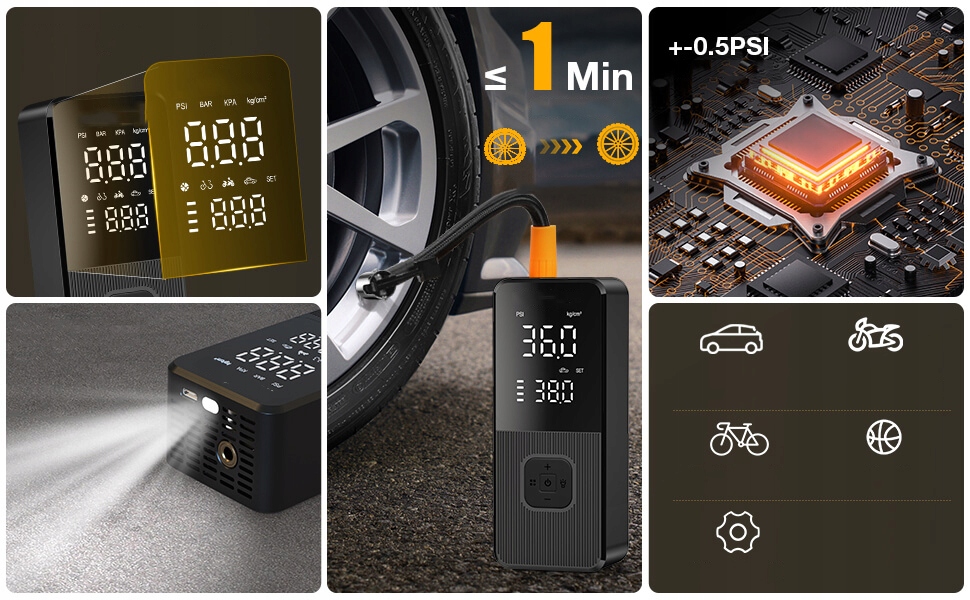 🧩 🧩 Упомянутое автоматическое выключение с запрограммированным давлением (автоматически выключается после заполнения) и функция обнаружения давления, которая обеспечивает вам большую удобство и предотвращает чрезмерную инфляцию. Единицы измерения давления: PSI, KPA, бар и кг/см².