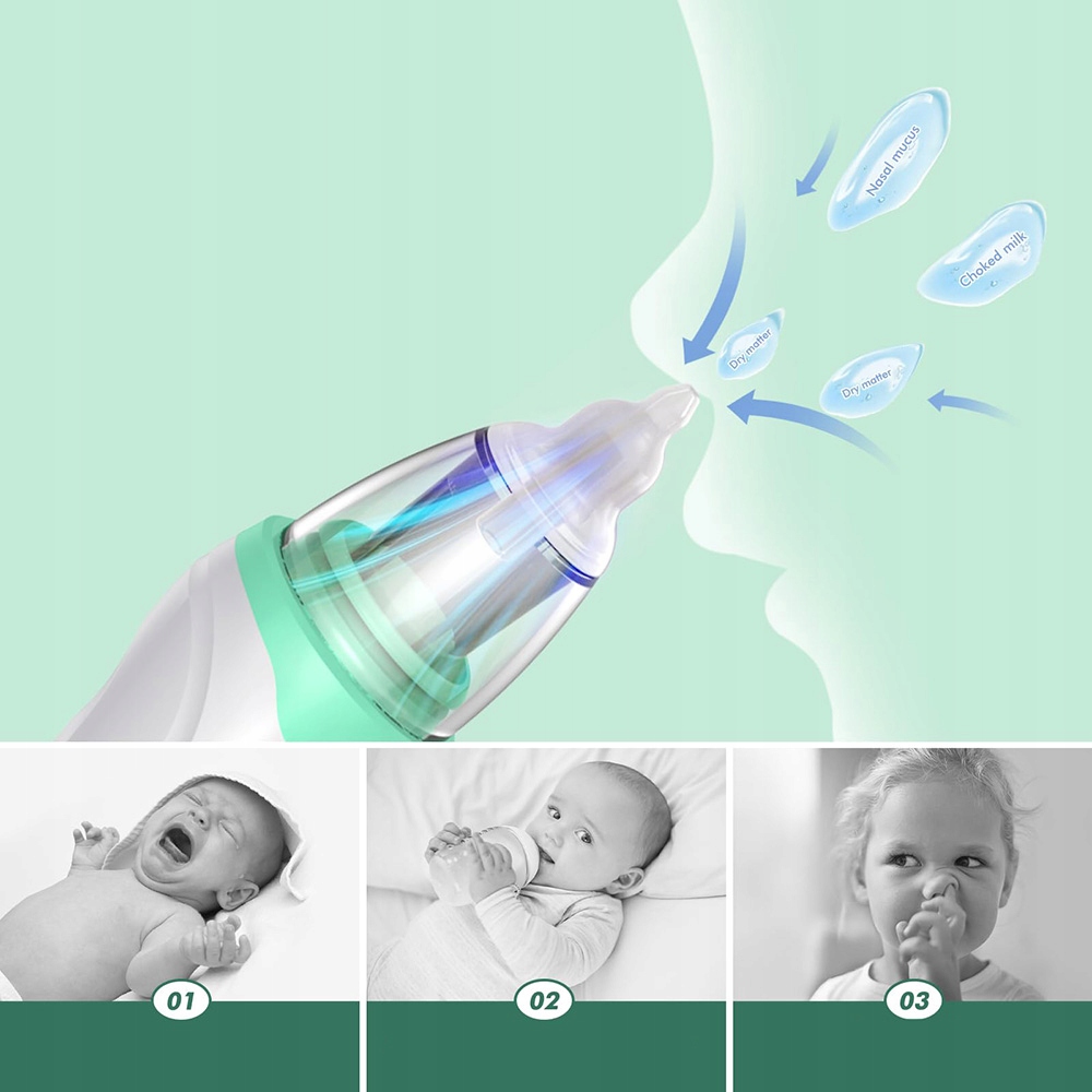 1. Три уровня всасывания могут быть отрегулированы, чтобы удалить практически каждый тип насморк. (Примечание: сначала смягчить постоянный насморк и слизь с носовой солью. Оставьте на 30 секунд до 1 минуты до использования аспиратора.)