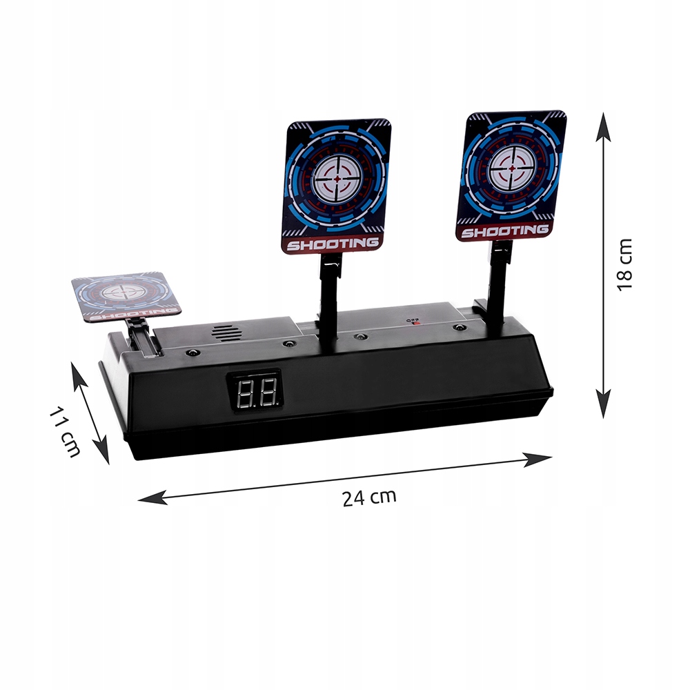 ☑️ В цель можно стрелять из пенопластовых дротиков. Она имеет световые и звуковые эффекты, что делает игру более привлекательной. После удара мы слышим звук разбитого стекла или аплодисменты.Кроме того, на щите имеется двузначный счетчик очков. Каждая мишень падает назад при попадании. Сбив три мишени, вы получаете 1 очко, а затем все они автоматически повышаются.