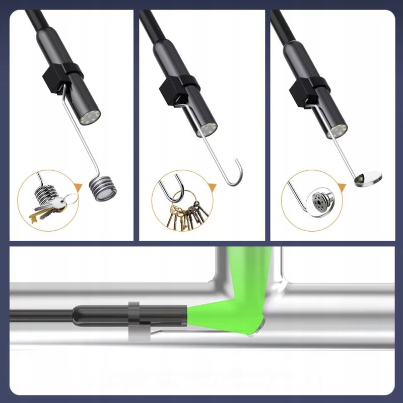 В комплект также входит несколько насадок для облегчения работы. с эндоскопом – насадка с зеркалом, насадка с магнитом, насадка с крючком и крепежными кольцами.
