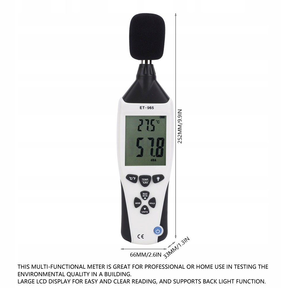 Функция: 1. Это удобный 5 в 1 измеритель окружающей среды, который измеряет интенсивность освещения, уровень звука, влажность, температуру и скорость ветра.
