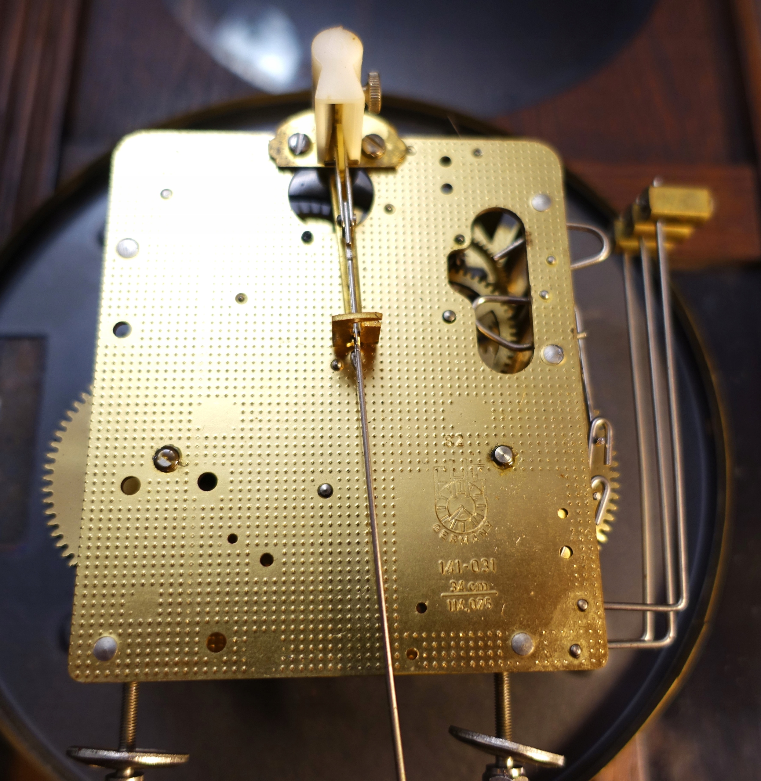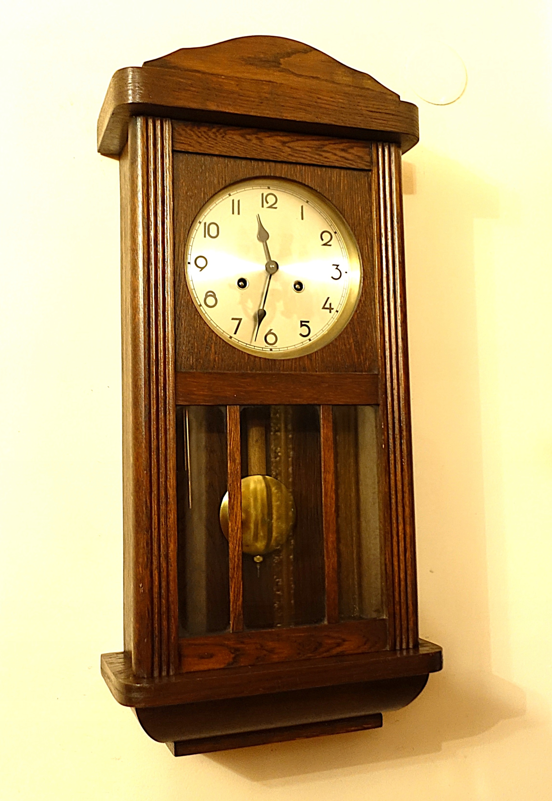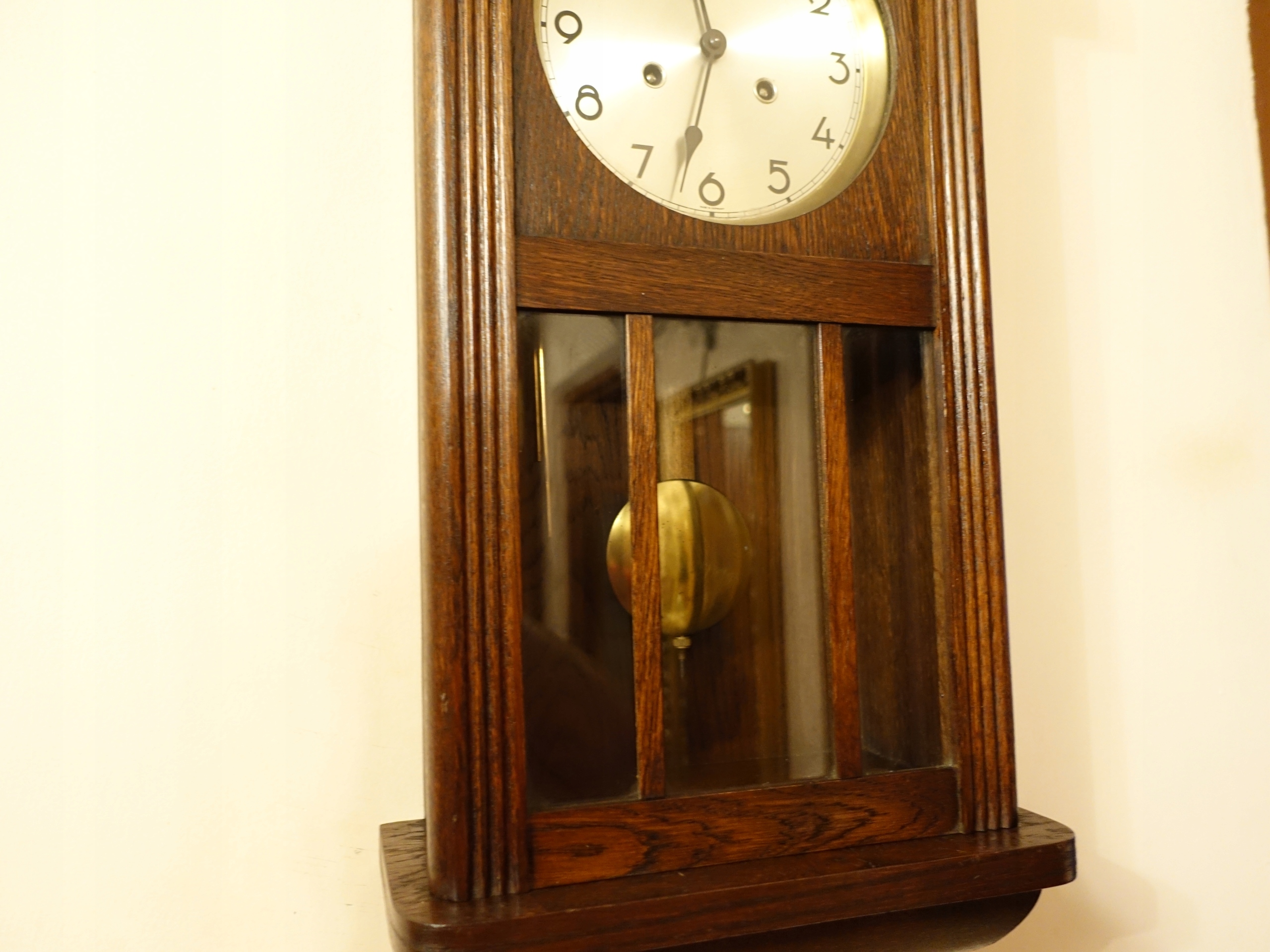FHS — часы от известного и авторитетного немецкого бренда, в красивой дубовой коробке. Механизм часов исправен и работает исправно. Часы отбивают полные часы и получасы с помощью трех молоточков на трех струнах. Часы отмечены подписью FHS на механизме. Корпус часов здоровый и прочный, изготовлен из дуба, без малейших признаков древоточца или других повреждений. Высота часов около 66 см, ширина около 31 см. В комплект входит заводной ключ