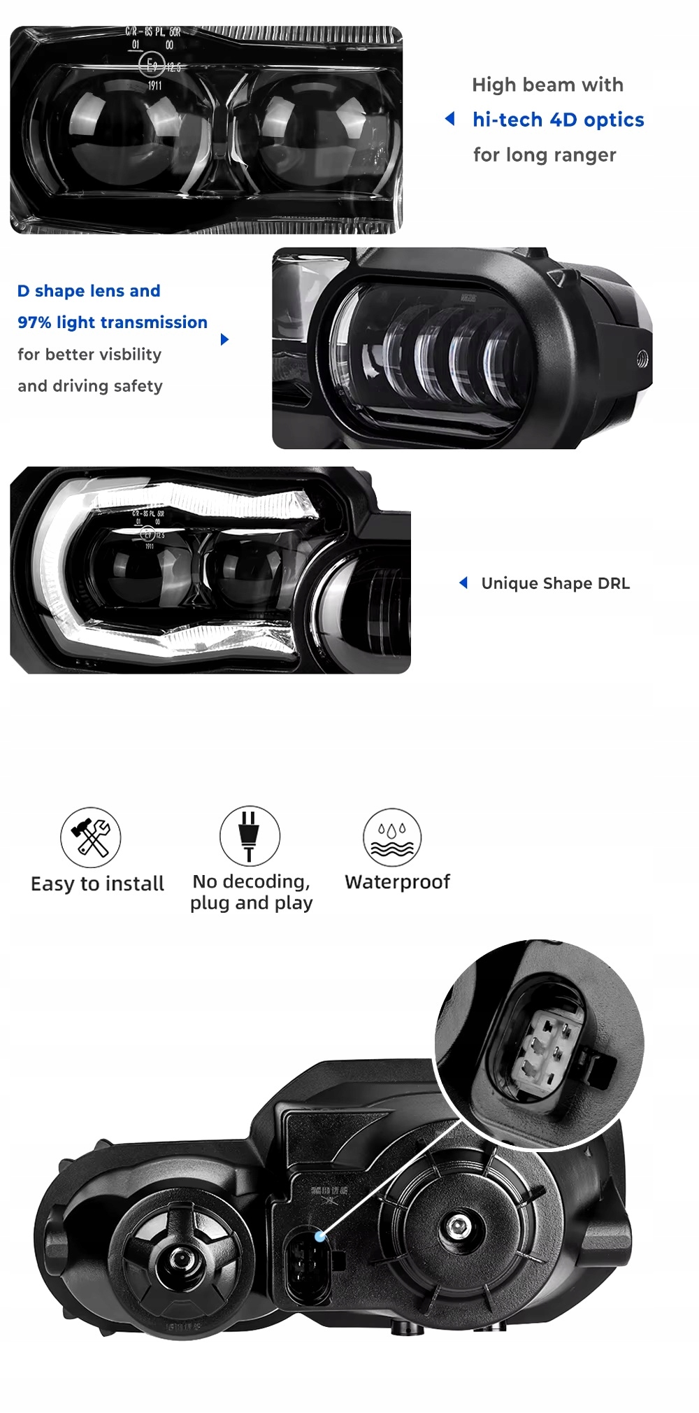 Лампа подходит к оригинальным монтажным отверстиям, вилка соответствует оригинальной установке мотоцикла.
