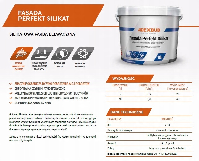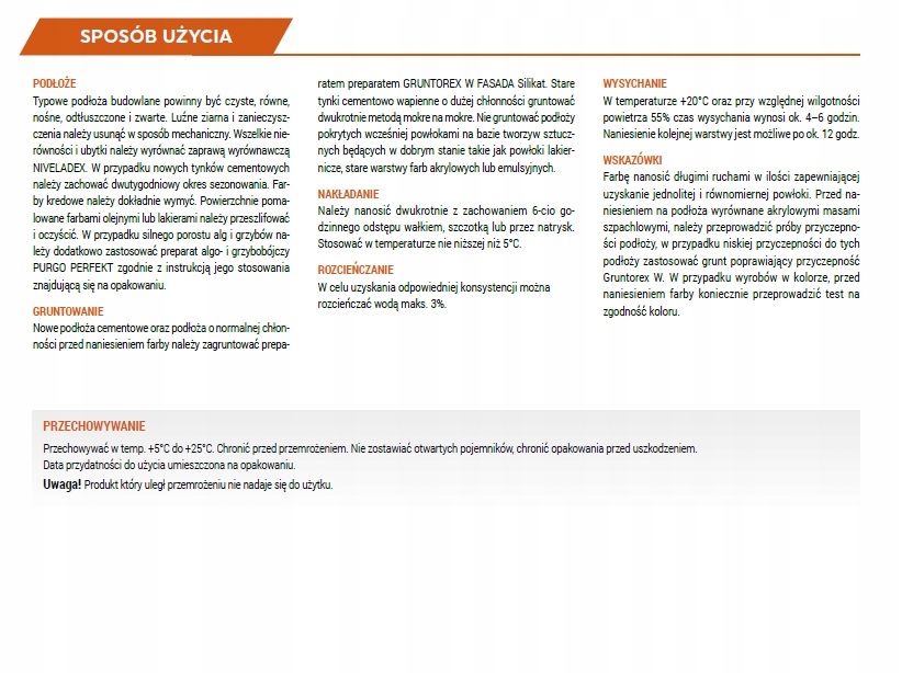 Силикатная фасадная краска для декоративно-защитных покрытий снаружи зданий на типовых строительных основаниях, а также для обновления поверхностей, покрытых тонкослойными штукатурками. Характеризуется очень высокой укрывистостью и устойчивостью к истиранию. Обладает высочайшей устойчивостью к микробиологической коррозии. Благодаря высокой паропроницаемости сохраняет минеральный характер покрытия. Предлагается в широкой цветовой гамме. Перед нанесением краски загрунтуйте основание силикатной грунтовкой Gruntorex W FACADE.
