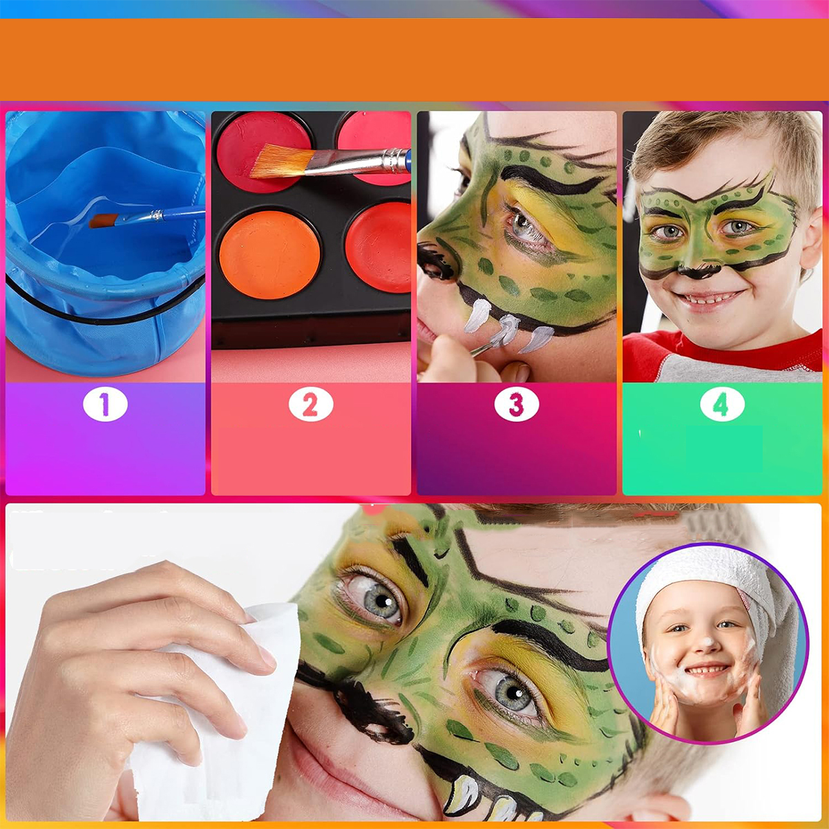 【Легко в использовании и очистке】 - Красочная краска для лица для детей быстро и длится много часов. Краски на основе воды очень удобны, просто увлажняют щетку или спрей небольшим количеством воды, чтобы смягчить поверхность красок для макияжа, погрузить их в краску и нанести на лицо. Также как краска для тела. Легко чистить влажной тканью или мыльной водой, не оставляя никаких следов.