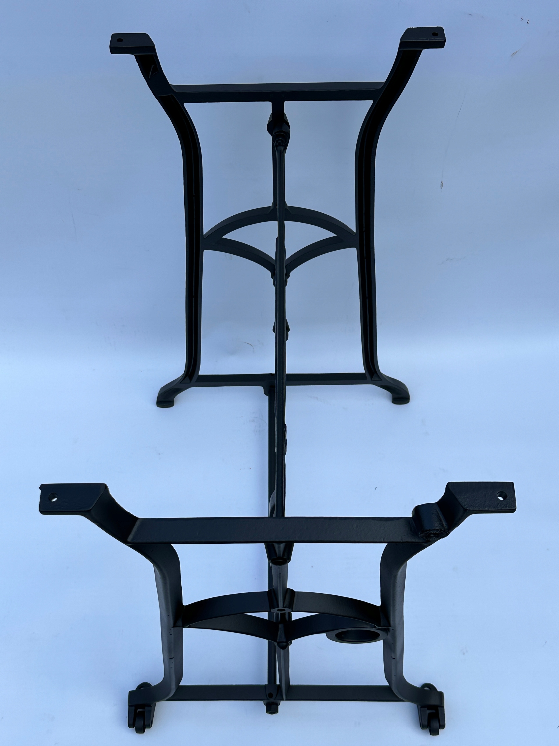 В верхней части имеются 4 оригинальных отверстия, через которые можно прикрепить стол вершина. Это видно на последней фотографии. Состояние - после профессионального ремонта. Отпескоструен и покрашен в черный цвет, как на фотографиях, готов к установке. После добавления столешницы он может служить, например, компьютерным столом. Если вы ищете что-то оригинальное, этот аукцион именно для вас.