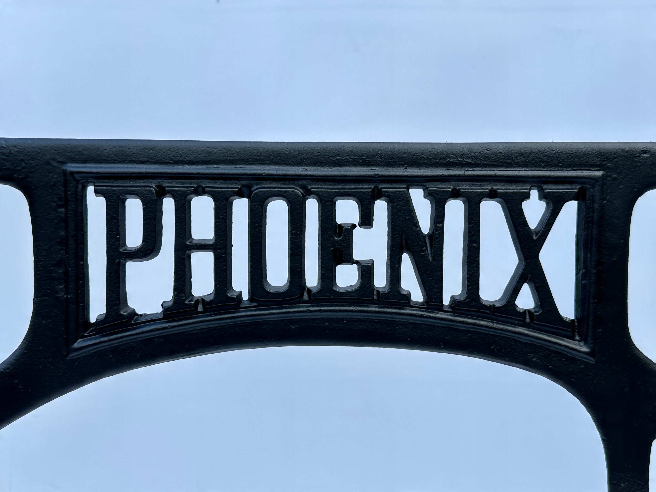 Предмет продажи — старая чугунная основа от швейной машины ФЕНИКС. Очень красивый узор. Посередине надпись ФЕНИКС. Оба колеса расположены внизу.