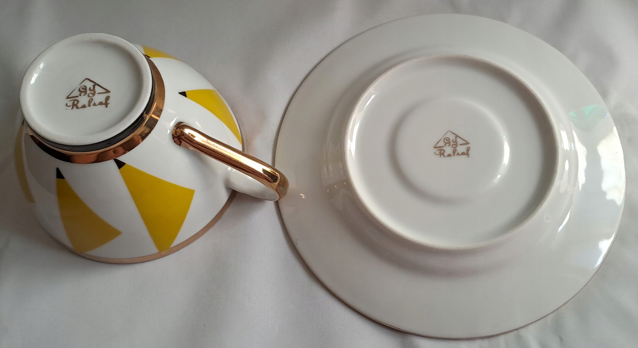 Filiżanka ze spodkiem żółte wzory, porcelana Wrocław