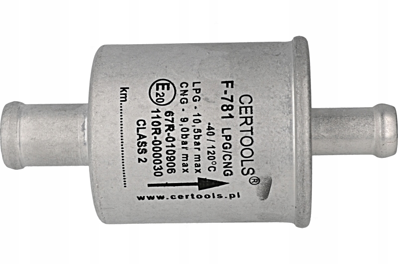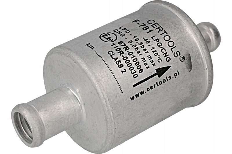 Один -временный фильтр в алюминиевом теле с общей длиной 98 миллиметров. Вход газа диаметром 16 миллиметров, выходной газ диаметром 12 миллиметров, полиэфирная вставка фильтра, направление потока газа на корпусе. Квалификационное давление 450 кПа, диапазон рекомендуемой рабочей температуры от -40 до +120 градусов по Цельсию.