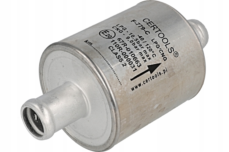 Алюминиевый одноразовый фильтр с бумажной вставкой. Газовпускное отверстие диаметром 16 миллиметров, газоотводное отверстие диаметром 14 миллиметров, общая длина 99 миллиметров, направление потока газа указано на корпусе. Квалификационное давление 450 кПа, рекомендуемый диапазон рабочих температур от -40 градусов Цельсия до +120 градусов Цельсия. E20-67R-010663 E20-110R-000031