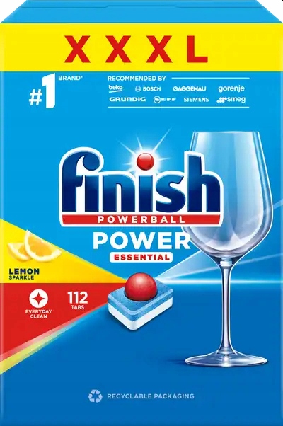 Finish Power Essential — многофункциональные таблетки для посудомоечной машины, которые не только имеют функцию предварительного замачивания и эффективно очищают посуду, но и удаляют сложные загрязнения, например осадок чая или остатки жира.