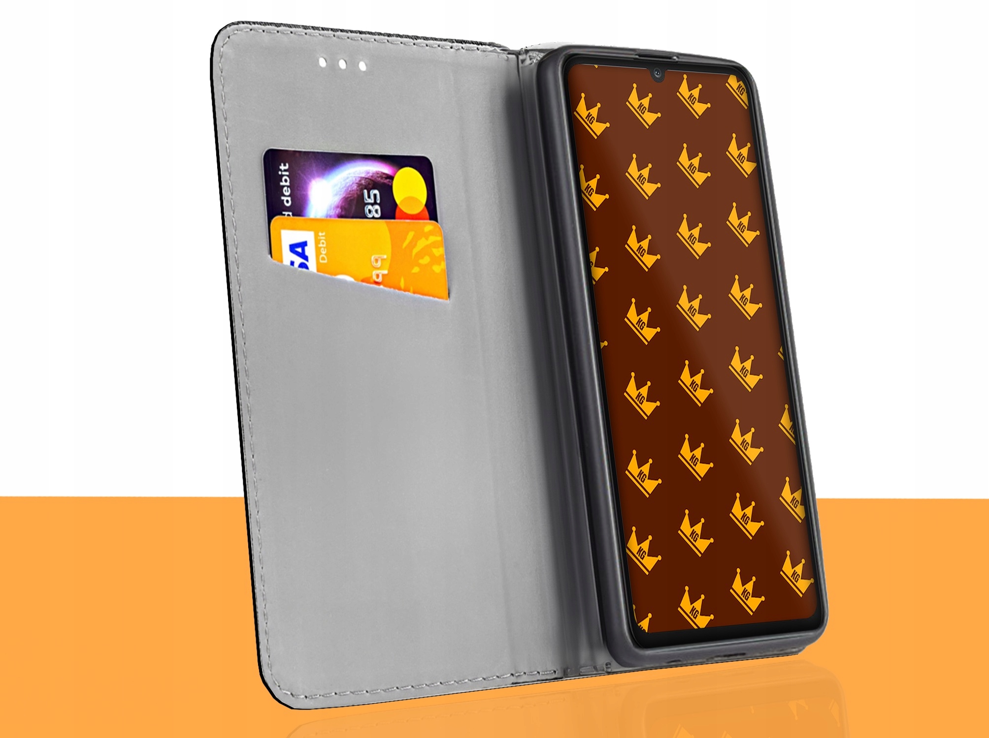 Функция подставки в откидном футляре позволяет удобно просматривать видео и фотографии. Чехол складывается в положение, при котором телефон удерживается горизонтально, чтобы экран смартфона был направлен на нас под прямым углом.