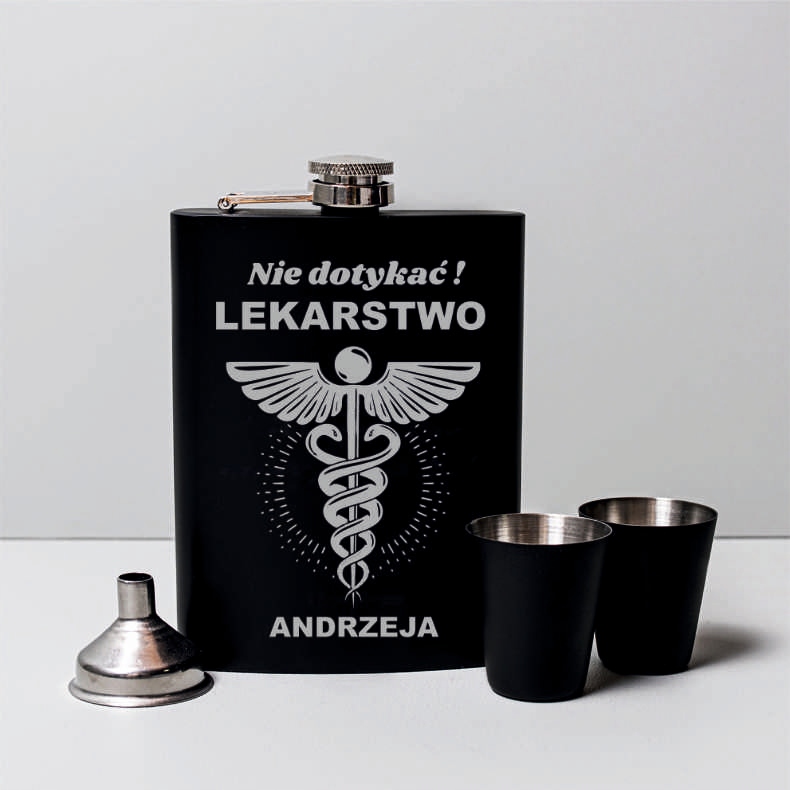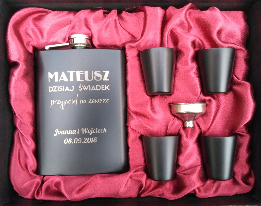 Фляжка черная + 4 стакана + воронка в коробке с вашей гравировкой!