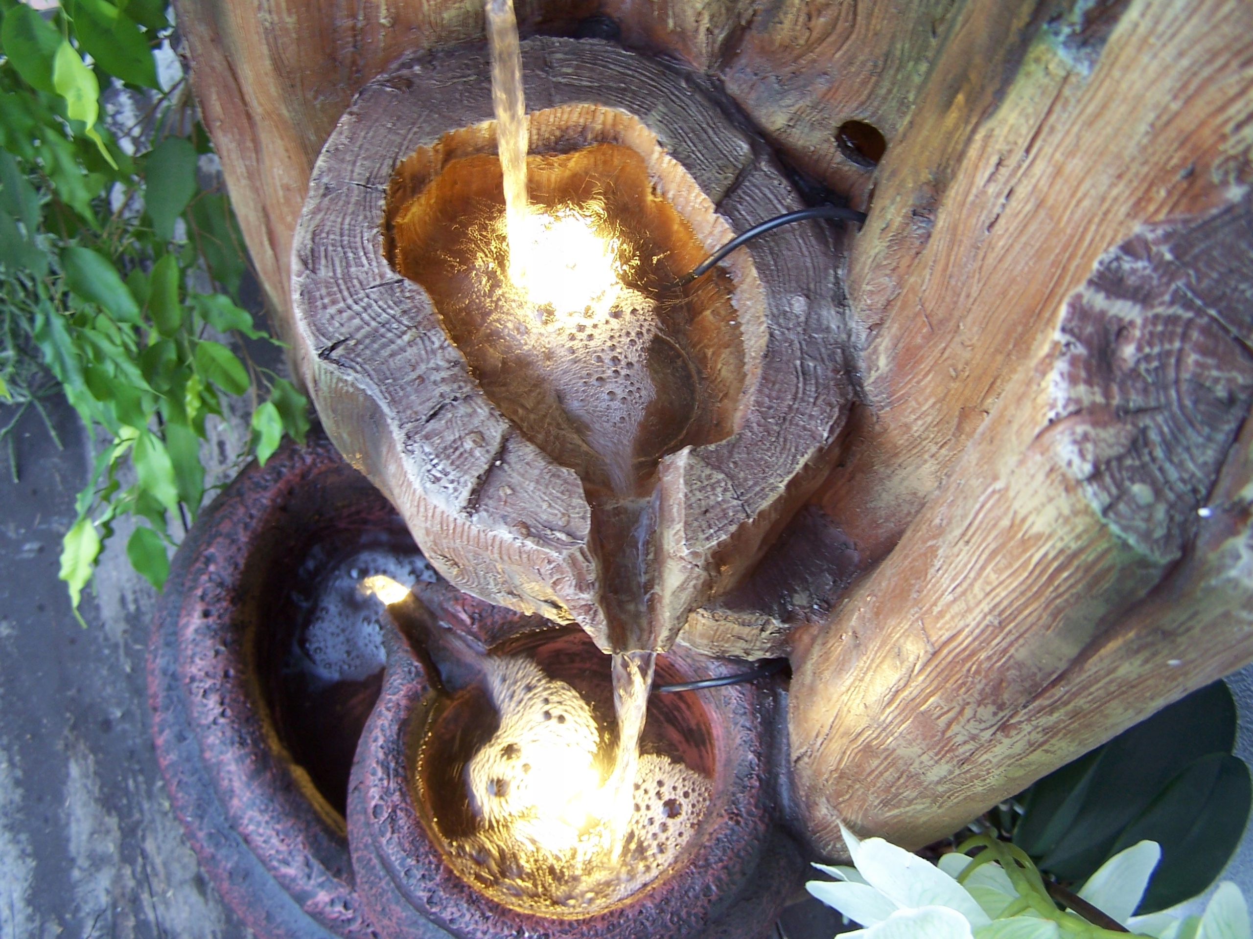 fountain in a closed circulation, water in the lower tank pumped into the upper vessel from where the cascading - under the influence of gravity flows down ...... .. This is not heard here but it is a nice and pleasant experience closing the eyes - you can feel the impression of being close to the natural stream,
