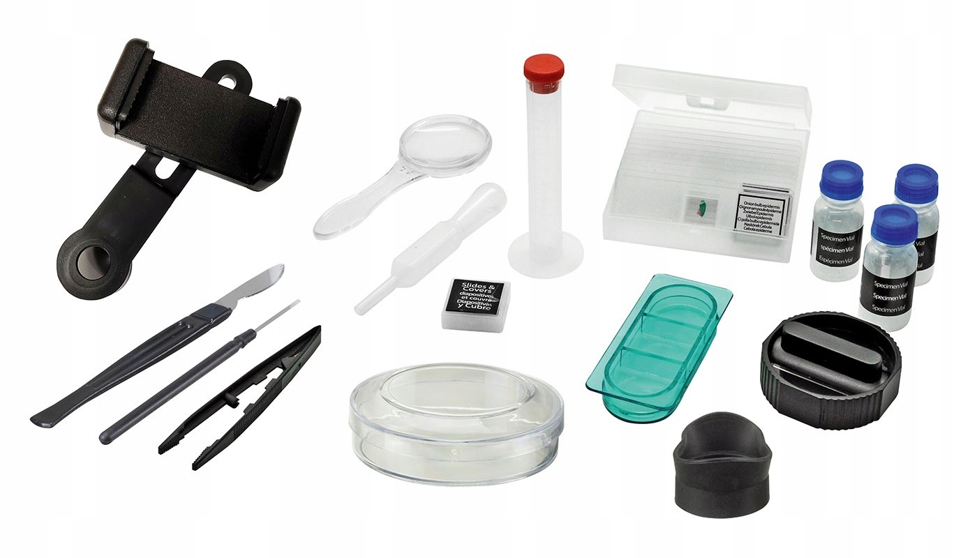 <р> - готовые препараты, 3 шт. <р> - коробка с набором предметных стекол <р> - коробка с покровными стеклами и этикетками <р> - резиновый наглазник <р> - фотоадаптер для смартфонов <р> - Чашка Петри <р> - инкубаторий <р> - пустые флаконы, 3 шт. <р> - гильотина <р> - скальпель <р> - пинцет <р> - капельница <р> - увеличительное стекло <р> - мерный цилиндр <р> - препарационная игла <р> - Батарейки АА, 2 шт.Список препаратов: