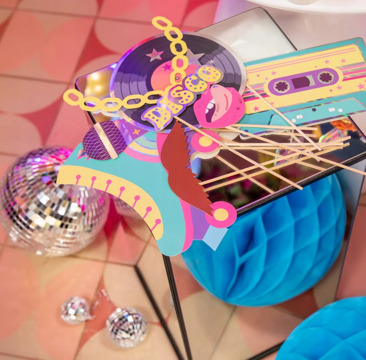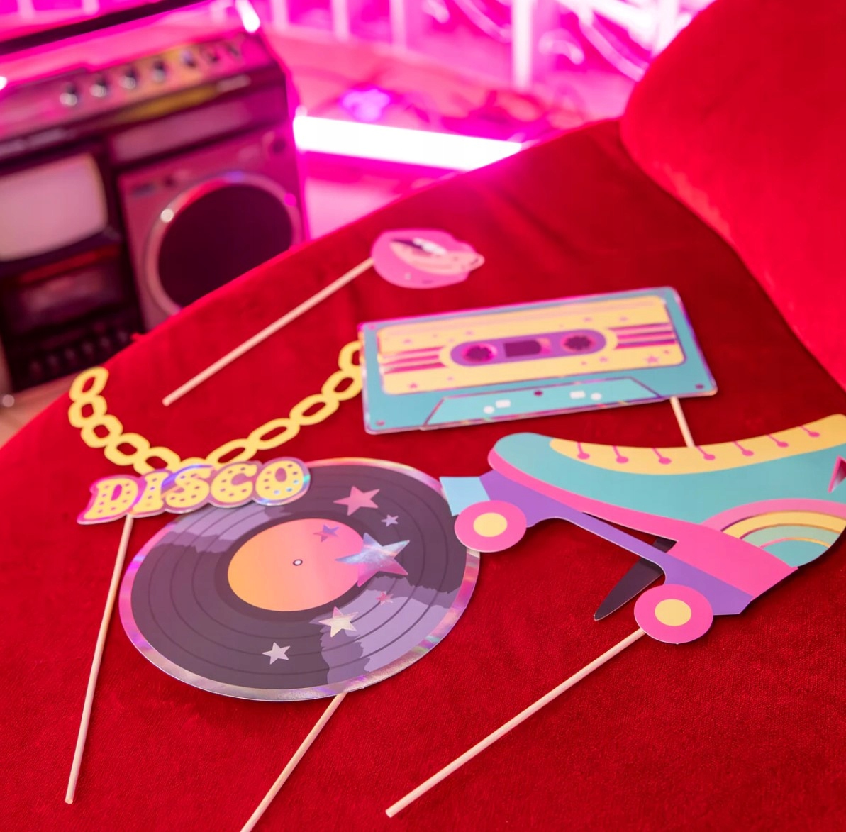 Картоны восемнадцати форм с тематикой РЕТРО ДИСКО: роликовые коньки, микрофон, цепочка на шею «ДИСКО», усы (2 шт.), звездная гитара , ретро-радио, кассета, рот, очки-звезды, очки с диско-светом, очки-сердечки, диско-шар, надпись "BOOGIE NIGHT", стрелка «DANCING QUEEN», надпись «DISCO PARTY», виниловая пластинка, парик в афро-стиле. Односторонний принт в мультяшном стиле. В комплект входят деревянные палочки и наклейки для крепления реквизита. Отличный гаджет для фотокабины, чтобы с юмором сделать фотографии на память.