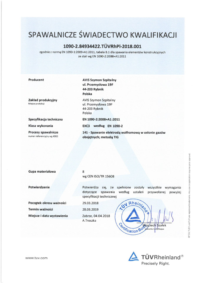 Повышая качество предлагаемой продукции, компания AVIS успешно прошла процедуру сертификации по стандарту PN-EN 1090, который, в частности, устанавливает стандарты в области производства. стальные конструкции. Сертификацию в этой области провел лидер рынка сертификационных и исследовательских услуг в Польше – TÜV Rheinland.