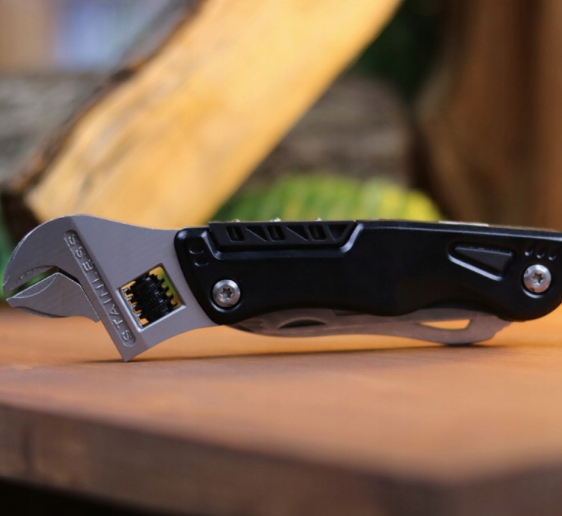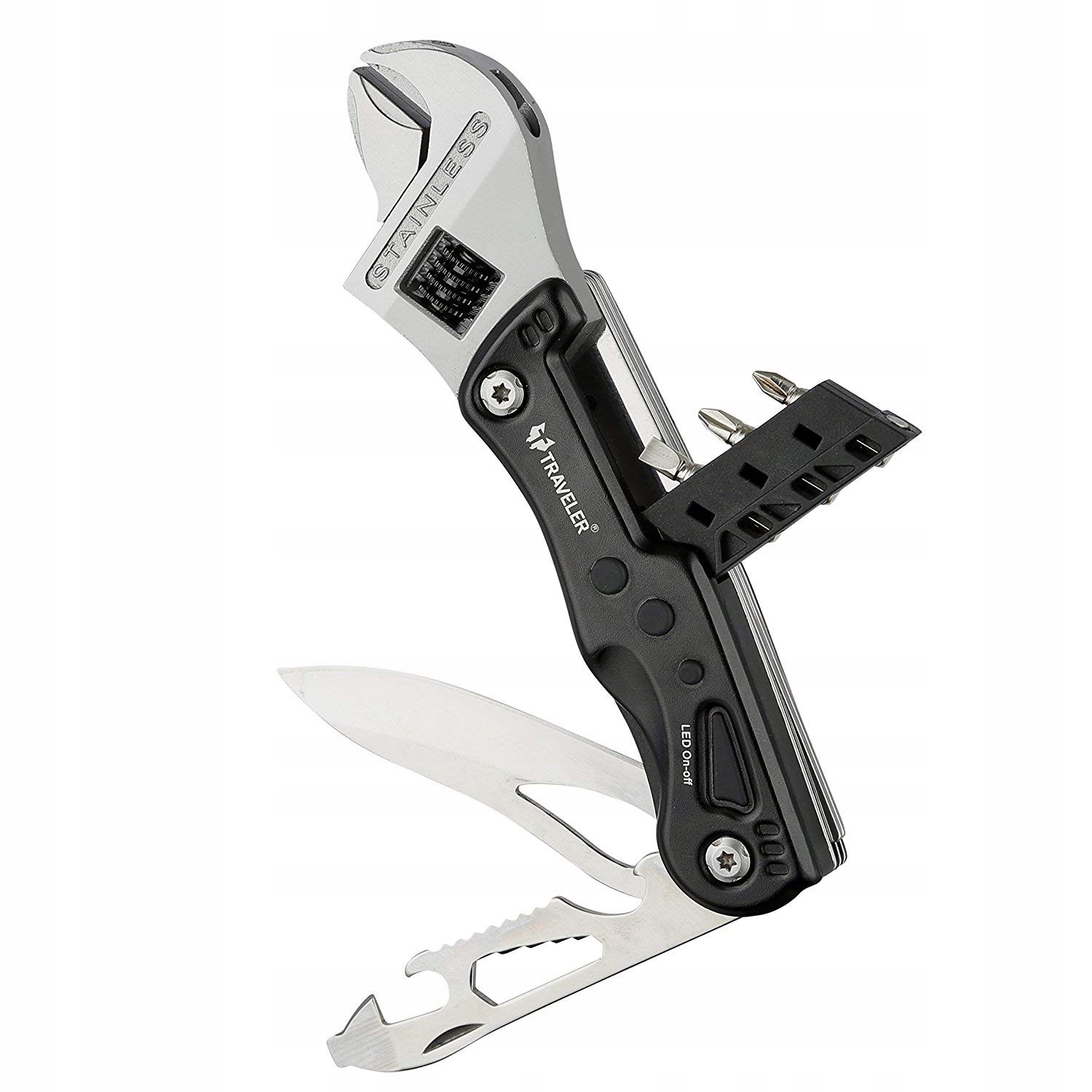 - Это незаменимый инструмент для каждого любителя DIY, который стоит иметь при себе на случай внезапных поломок. Содержит множество функций в одном инструменте, важнейшая из которых — разводной (французский) ключ. Дополнительно в него входят следующие функции: нож, набор из 3 бит, универсальный шестигранный ключ, плоская отвертка, пила, открывалка для бутылок и консервных банок. В комплект также входит черный тканевый чехол для инструмента.