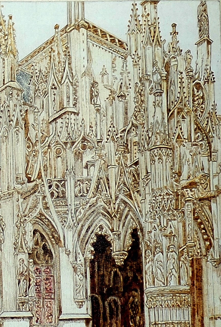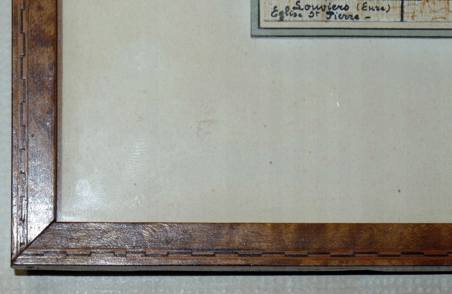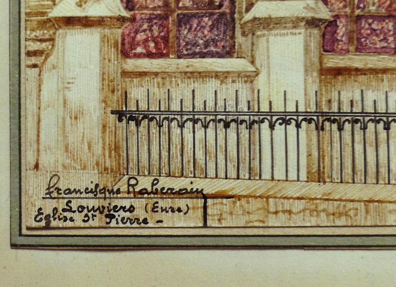 ФРАНЦИСК РАБЕРЕН (1888 - ? ) «Вид южного фасада церкви Св. Петра в Лувье» (Нормандия). Рисунок пером (сепия), размытый акварелью, на бумаге размером 15,5 х 21 см, наклеенный на картон. Подписано и написано ручкой в левом нижнем углу: «Франсиск Раберен/Лувье (Эр)/Эглиз Сен-Пьер». Размеры в раме: 27,5 х 33 см.