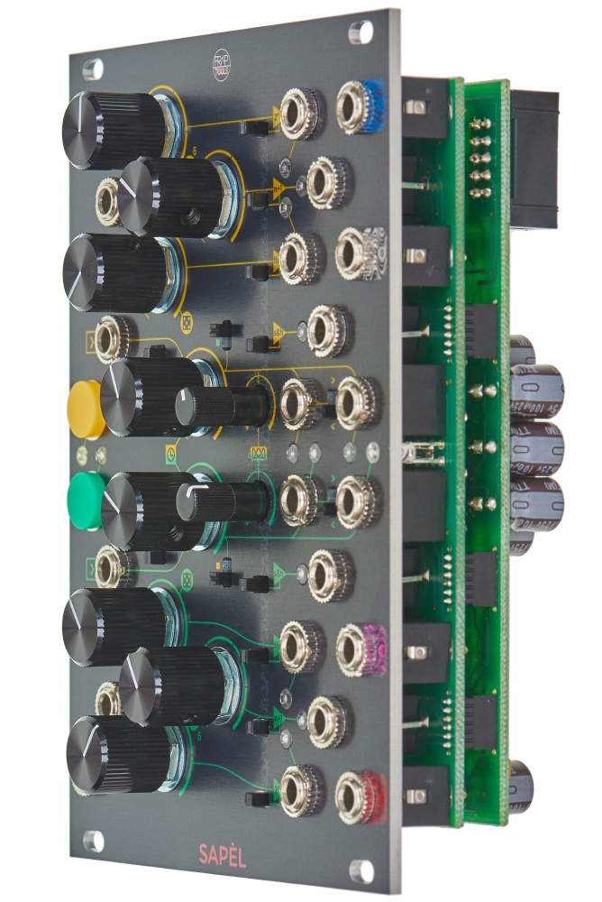 Продвинутые случайные эксперименты. Sapél состоит из многоканального источника шума и двух сложных случайных секций. Дополнительно модуль имеет двойной тактовый генератор. Подробно имеются выходы для белого, синего, розового и красного шума. Случайные секции создают переменные и квантованные напряжения, а также отбирают и сохраняют материал. Тактовый генератор состоит из двух каналов, которые можно комбинировать. Каждая схема обеспечивает нормальный и случайный тактовый выход. Опции триггера, несколько входов управляющего напряжения и функции вероятности дополняют функционал Sapéla.