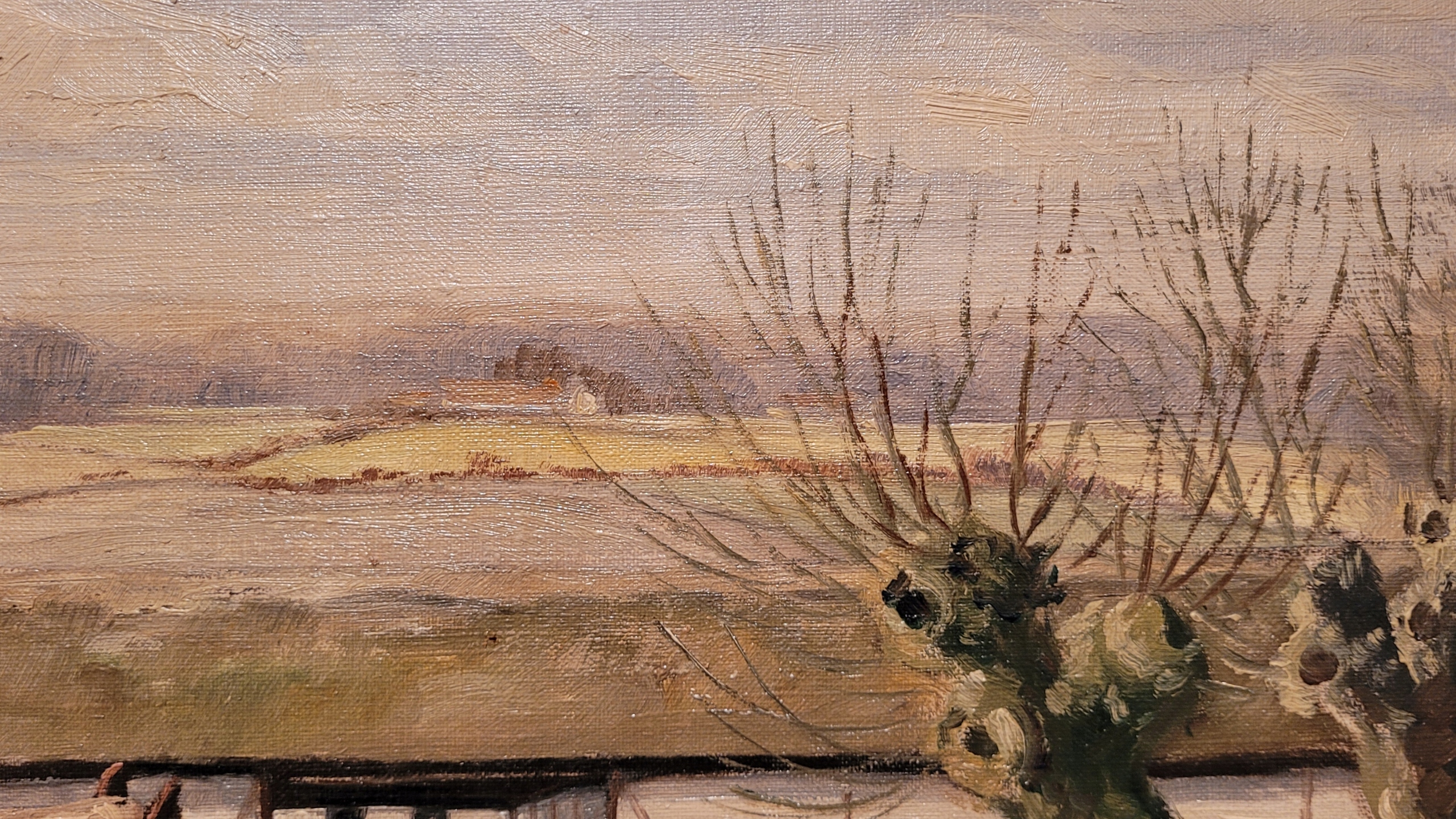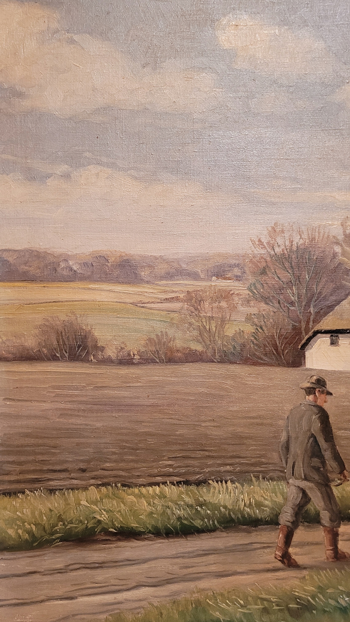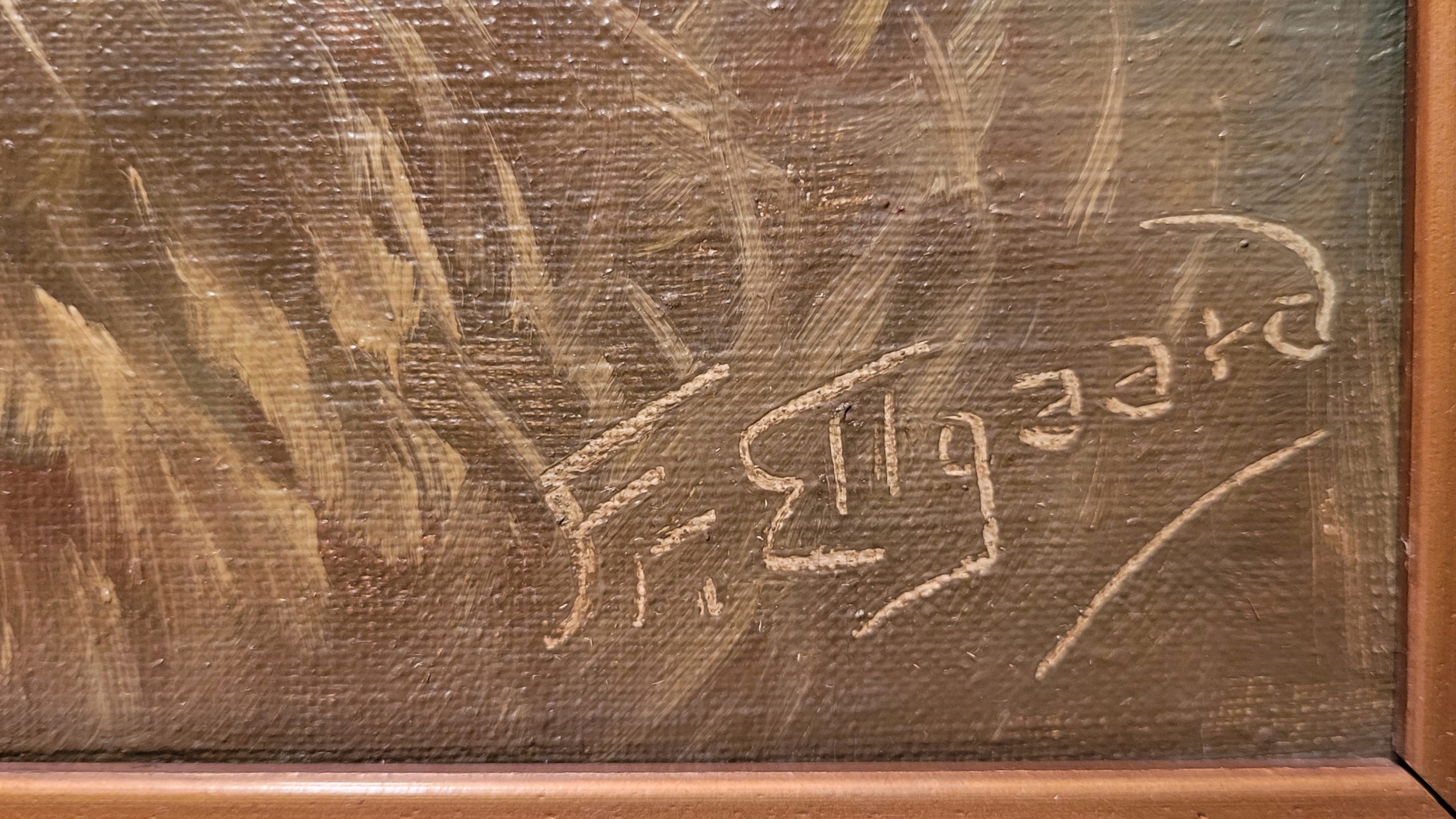 В правом нижнем углу есть ссылочный номер художника - fr.ellgaard. 1896 -) - Известно и оцененный немецкий - датский художник. Выполнены самыми важными порталами, посвященными произведениям искусства. Его картины были выставлены в знаменитых аукционных домах Мин. Брун Расмуссен и Лауриц. Фредерик Эллгаард был известен в первую очередь своими масляными картинами с изображением сельских и крестьянских идиллов, которые он создал в больших количествах в 1930, 1940 и 1950 годах, например, «Фермерский Орка», «Сиано», «Лошади на ферме» и «пасущихся лошадей на реке». Его работы с морскими мотивами редки. Его картины висят во многих датских салонах и в некоторых датских музеях. В 1960 году его работы были более выразительными, такие как природа работы «лесной дороги». Когда прозвище «Отец Эллгаард» прикасался к нему, он часто использовал прозвище «Kskunstellgaardson».