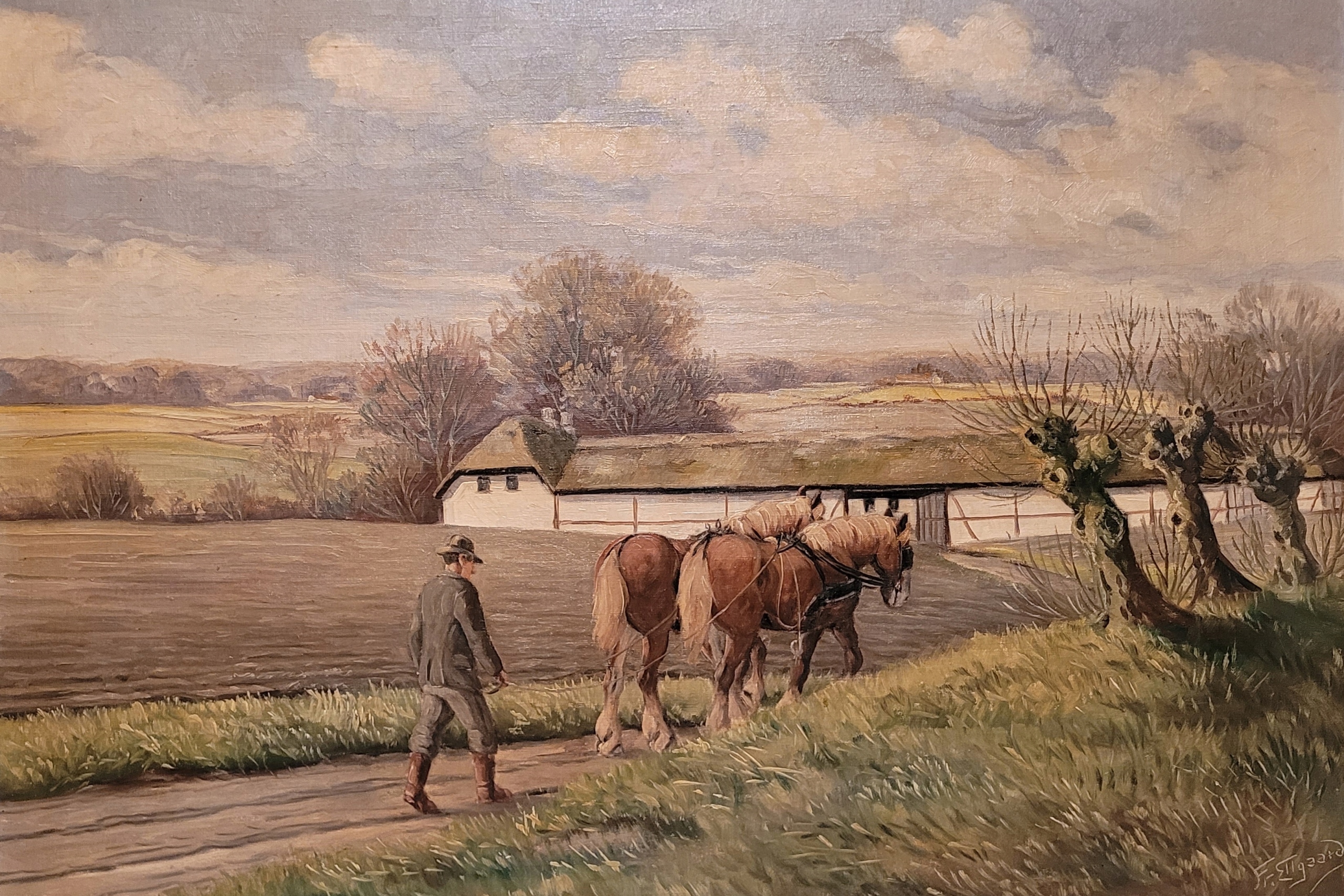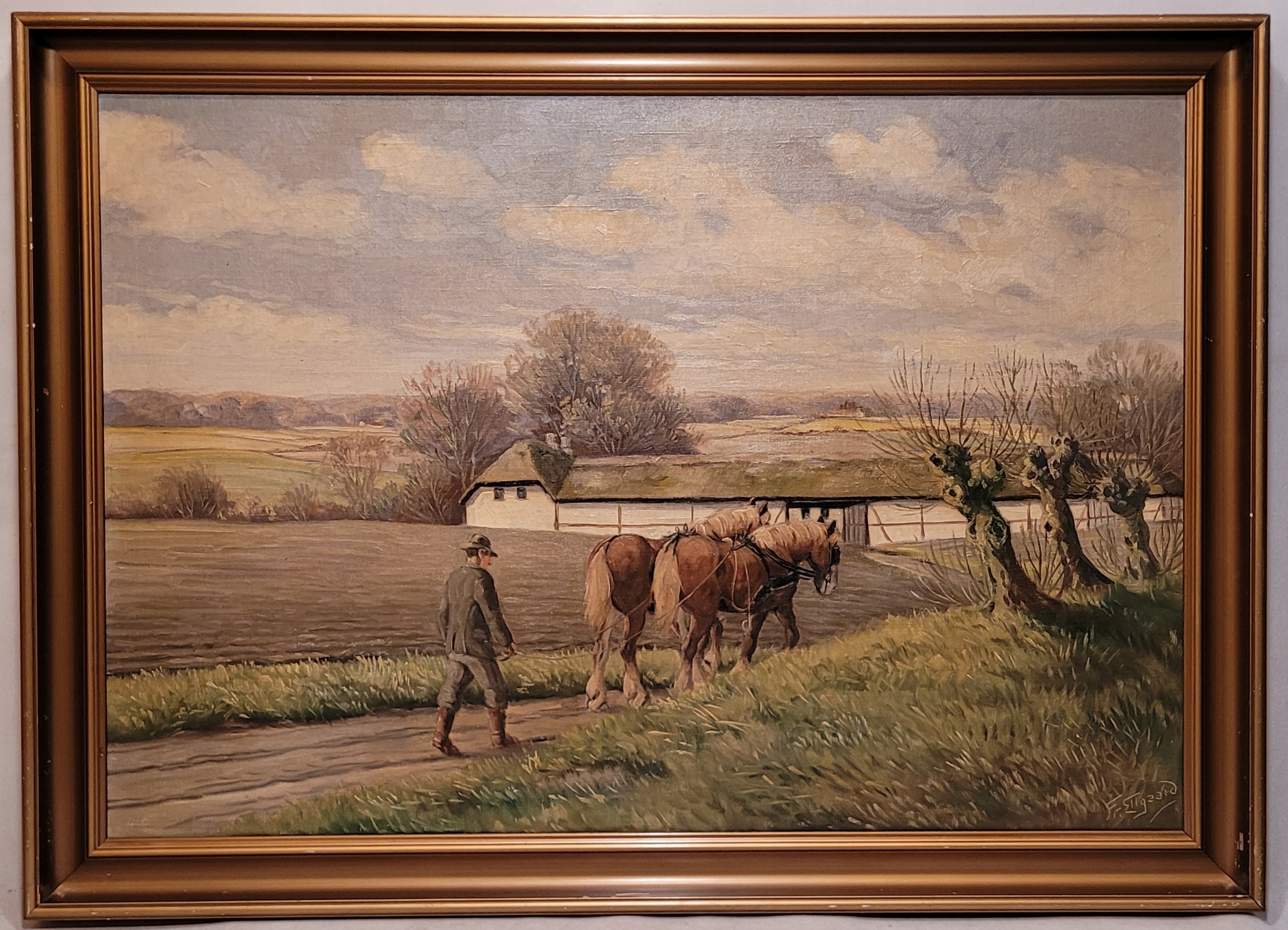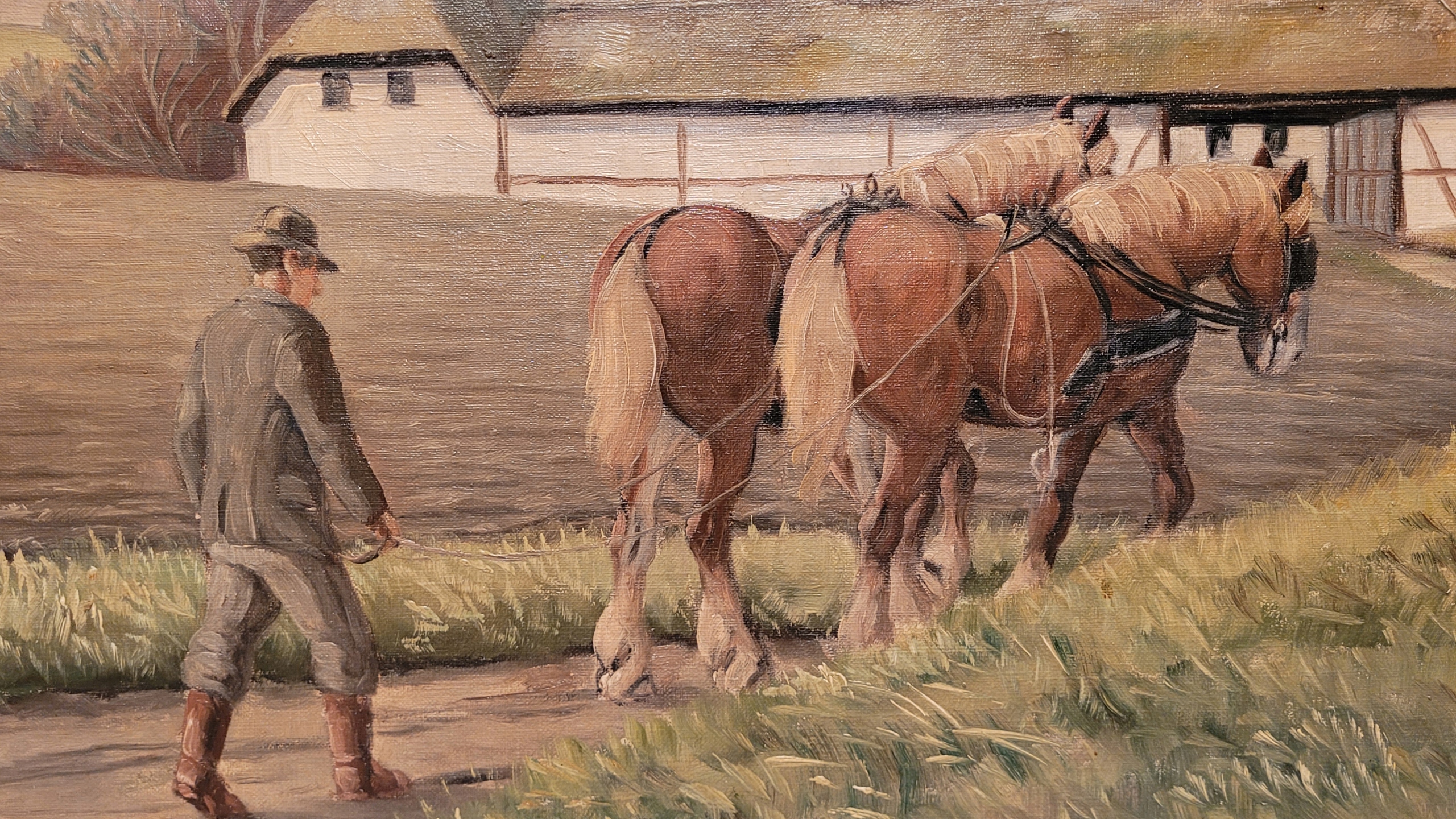 Фредерик Эллгаард (1896 -) - «Сельская сцена с лошадьми», нефтяная картина.