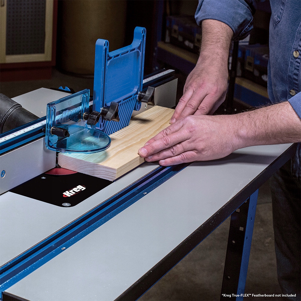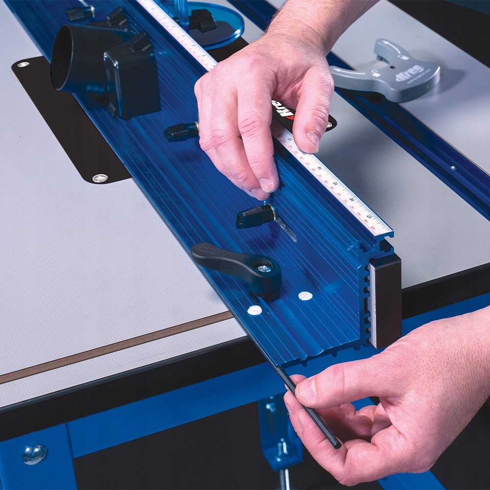 Одним из основных элементов является ограждение Kreg для фрезерного стола из анодированного алюминия. Упор регулируется одной рукой, оснащен Т-образным пазом и двухрычажным замком для точного фрезерования. Кроме того, он оснащен шкалой, облегчающей регулировку упора в зависимости от используемого фрезы. Микроконтроллер облегчает настройку и обеспечивает точность.
