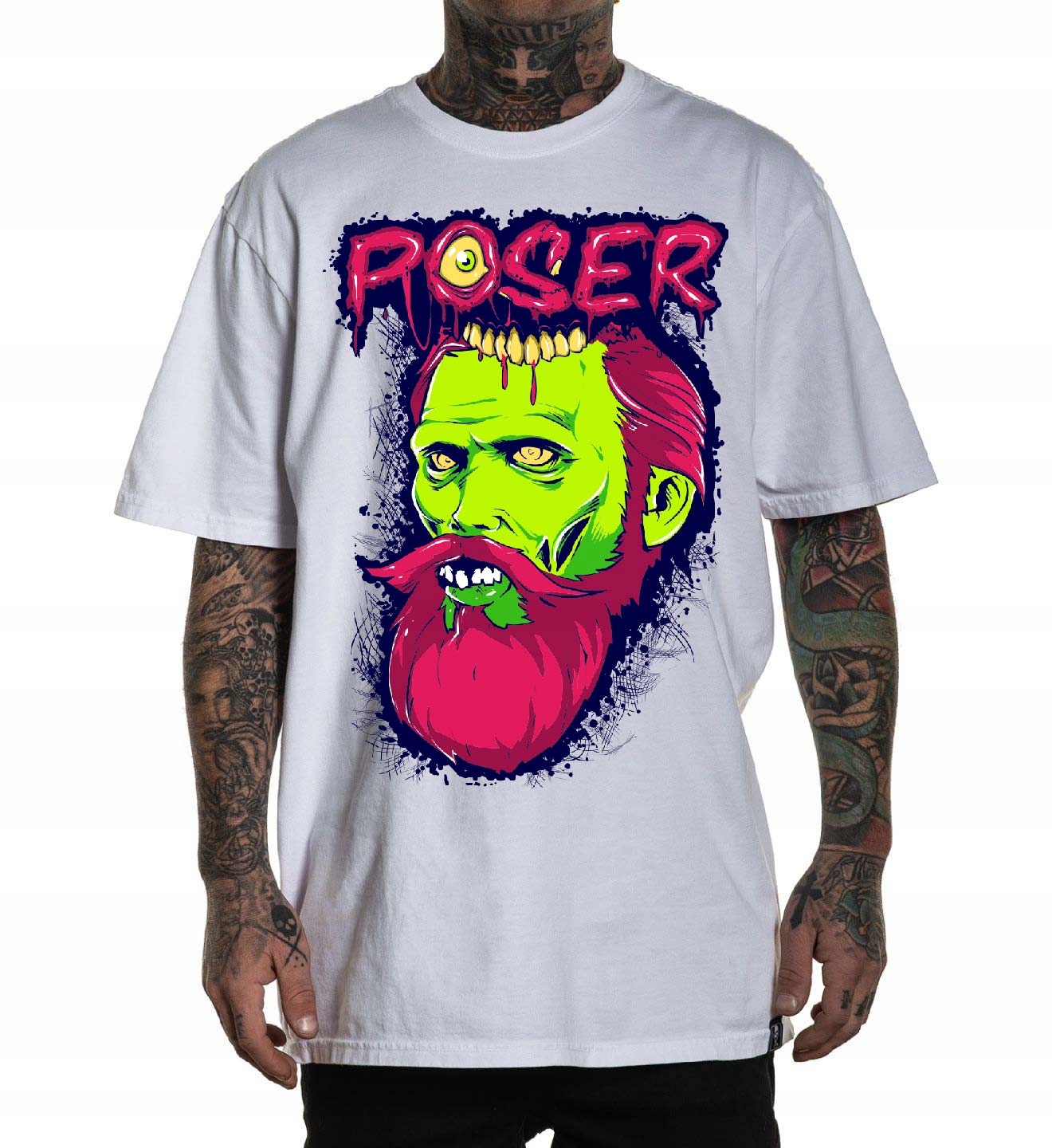 Эта футболка представляет собой необычный и смелый предмет одежды, который демонстрирует устрашающего монстра с зеленым лицом, дикой бородой и угрожающие зубы. Это уникальный мотив для любителей темных и фантазийных узоров, которые хотят выделиться и выразить свои интересы с помощью одежды.
