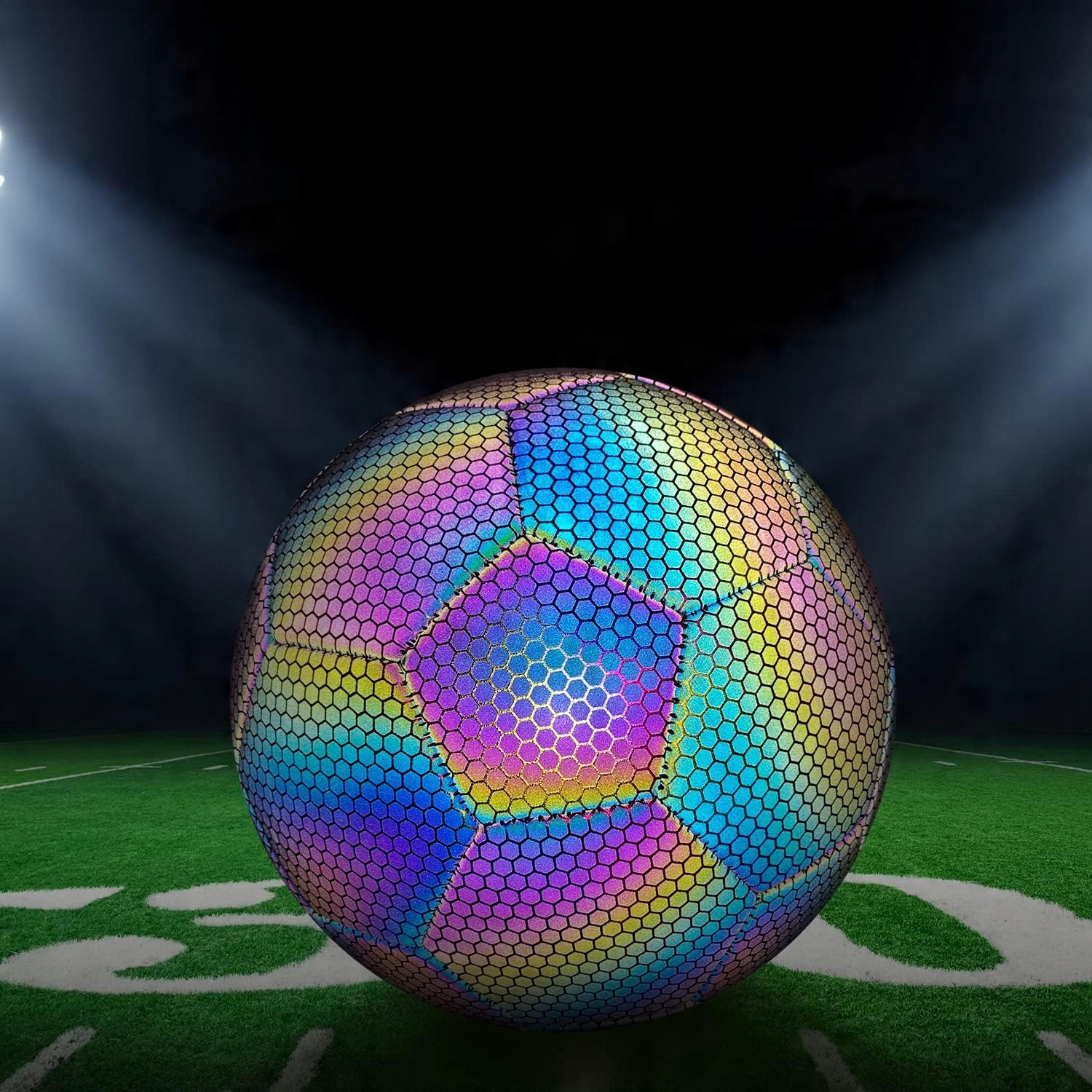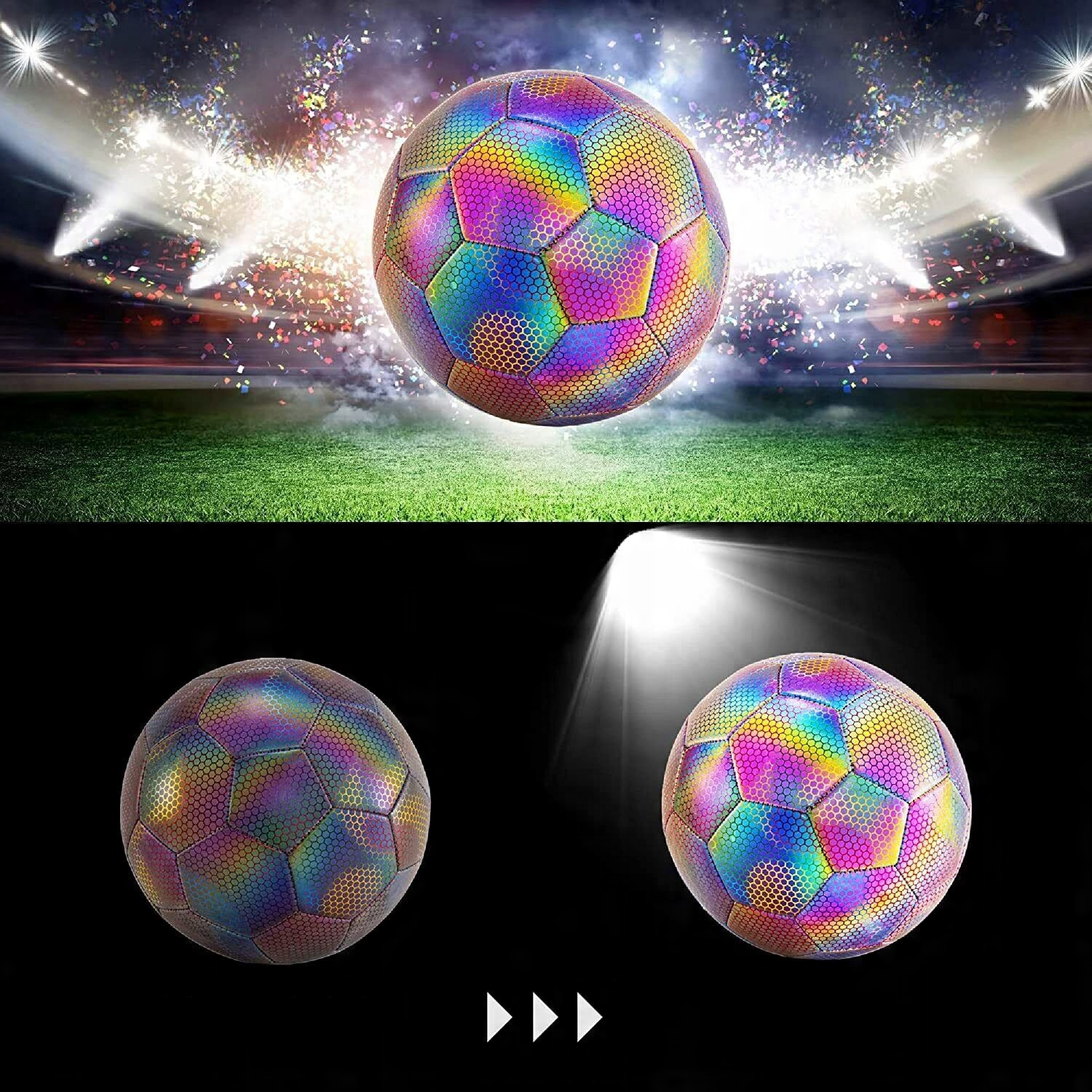 Голографический Светоотражающий светящийся футбольный мяч изготовлен из светоотражающей искусственной кожи премиум-класса, при попадании света на это покрытие возникает светоотражающий эффект, сам футбольный мяч не светится. Под некоторыми углами оно кажется темным, но если посмотреть на свет, оно может быть очень ярким. Идеальный эффект светящегося футбольного мяча – это съемка фото или видео со вспышкой.