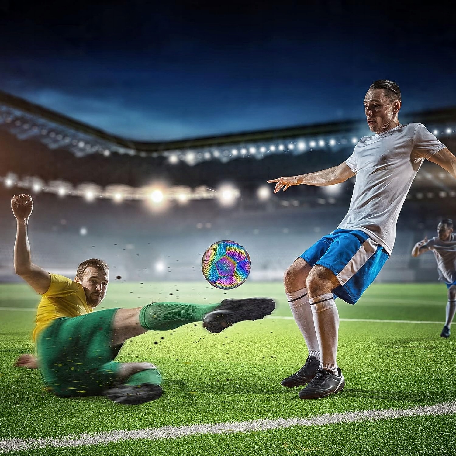 ✔✔✔ ШИРОКОЕ ПРИМЕНЕНИЕ - Этот уникальный голографический светоотражающий мяч Футбольный мяч имеет хорошие характеристики как в помещении, так и на открытом воздухе во время дневных или ночных тренировок, идеально подходит для травы, футбольных полей, задних дворов или в помещении. Наслаждайтесь драгоценными моментами, играя в футбол с семьей и друзьями.