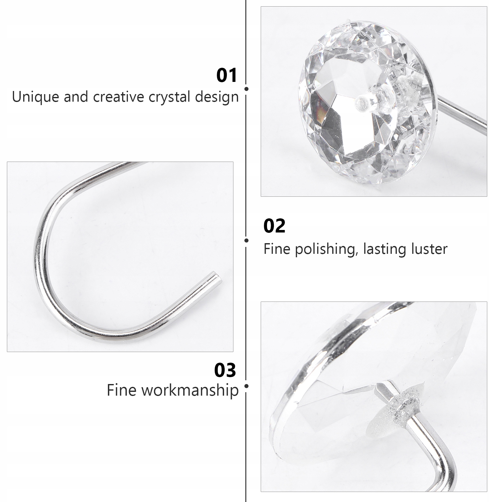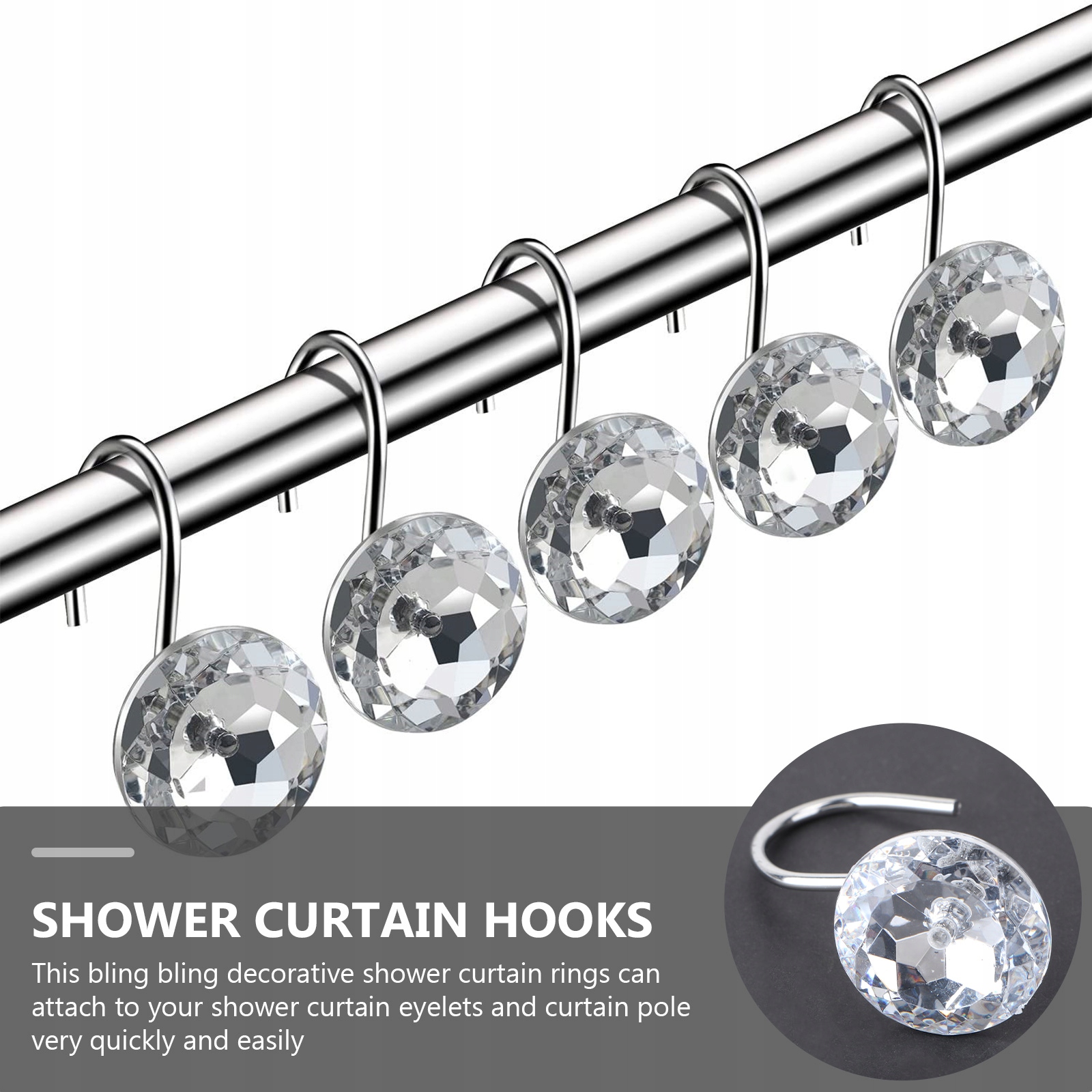 - Эти блестящие крючки для занавесок для душа изготовлены из прочной стали с полированной отделкой, сверкающие стразы обеспечивают длительный блеск и устойчивость к ржавчине.