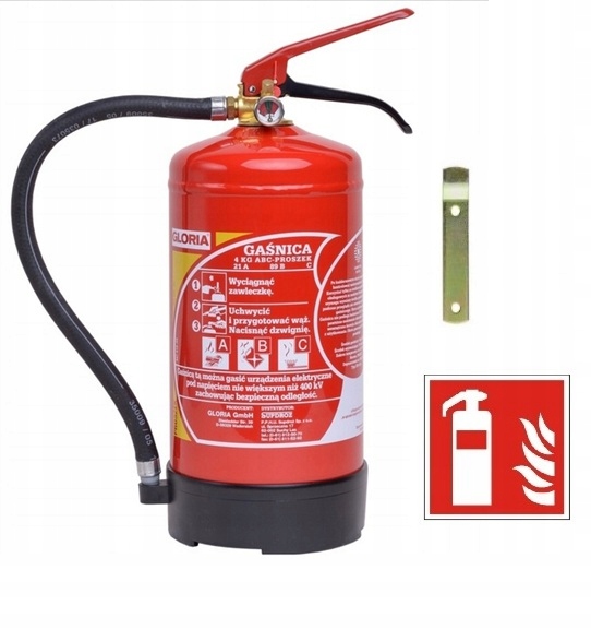 Gaśnica proszkowa Gloria 4 kg GP-4x ABC z legalizacją, wiszakiem i znakiem