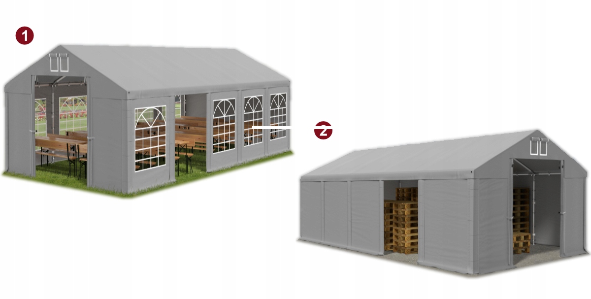 Палатки используются как: склад или палаточный зал, выставочный зал, ангар, склад или складская палатка. Широко используется в промышленности, ее можно использовать для создания дополнительного крытого пространства в качестве промышленной палатки.