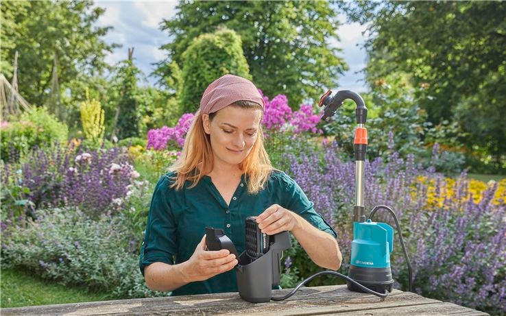 GARDENA 2000/2 18V P4A Аккумуляторный погружной насос для чистой воды - в комплект входит литий-ионный аккумулятор 18 В и зарядное устройство серии POWER FOR ALL ALIANCE. В зависимости от режима работы время работы составляет до 65 минут.