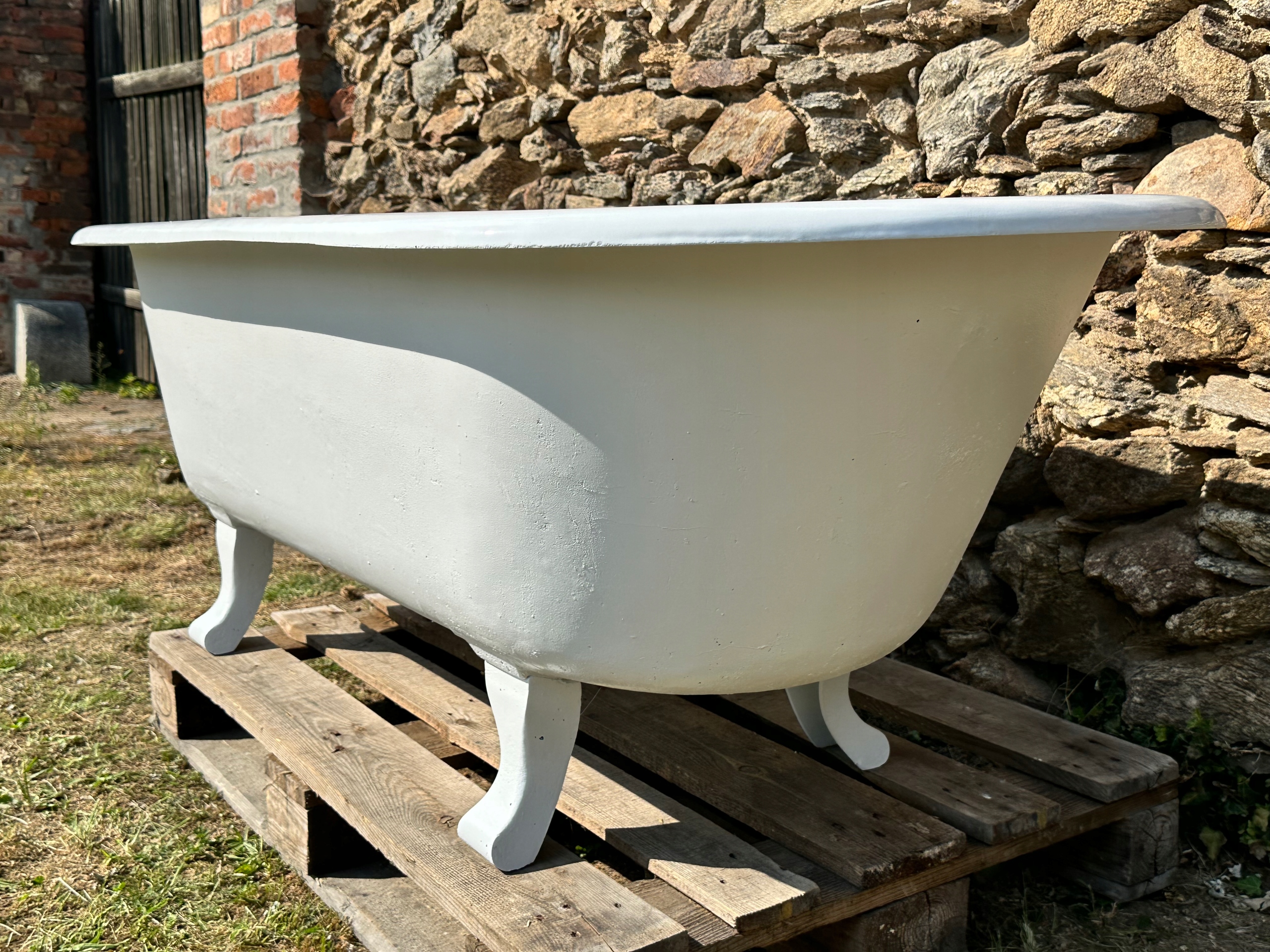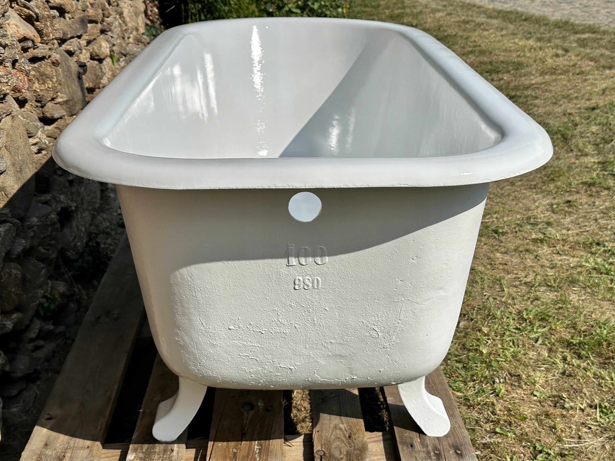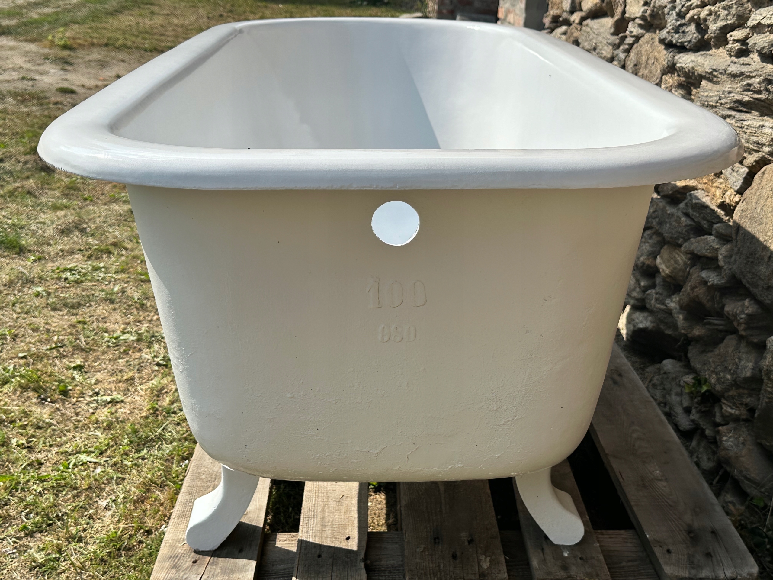 Предмет продажи — красивая, старинная, отдельно стоящая чугунная ванна довоенной эпохи. Уникальное изделие с красиво изогнутыми ножками. На спине надпись 100 980. Интересная модель с широким краем.