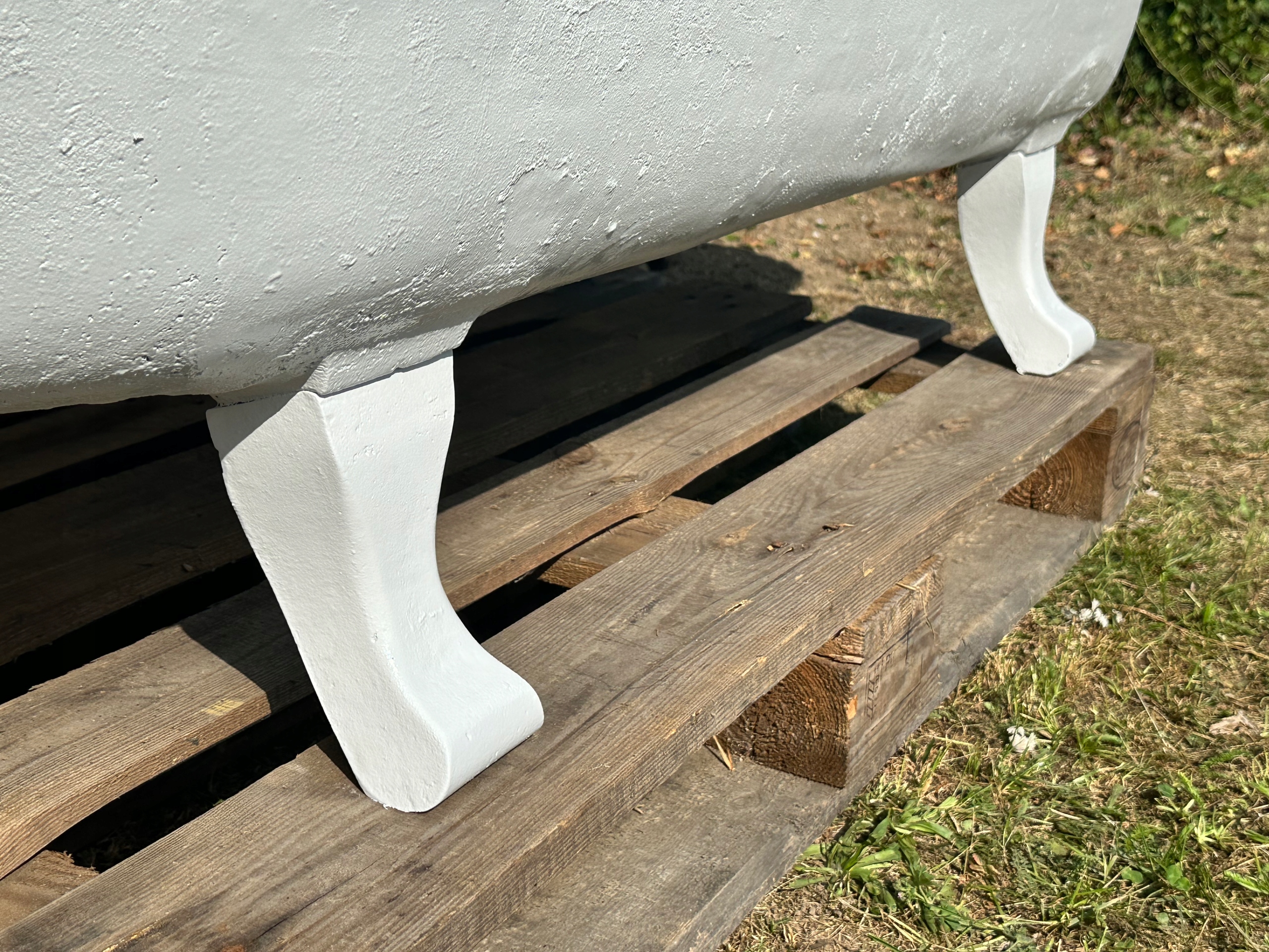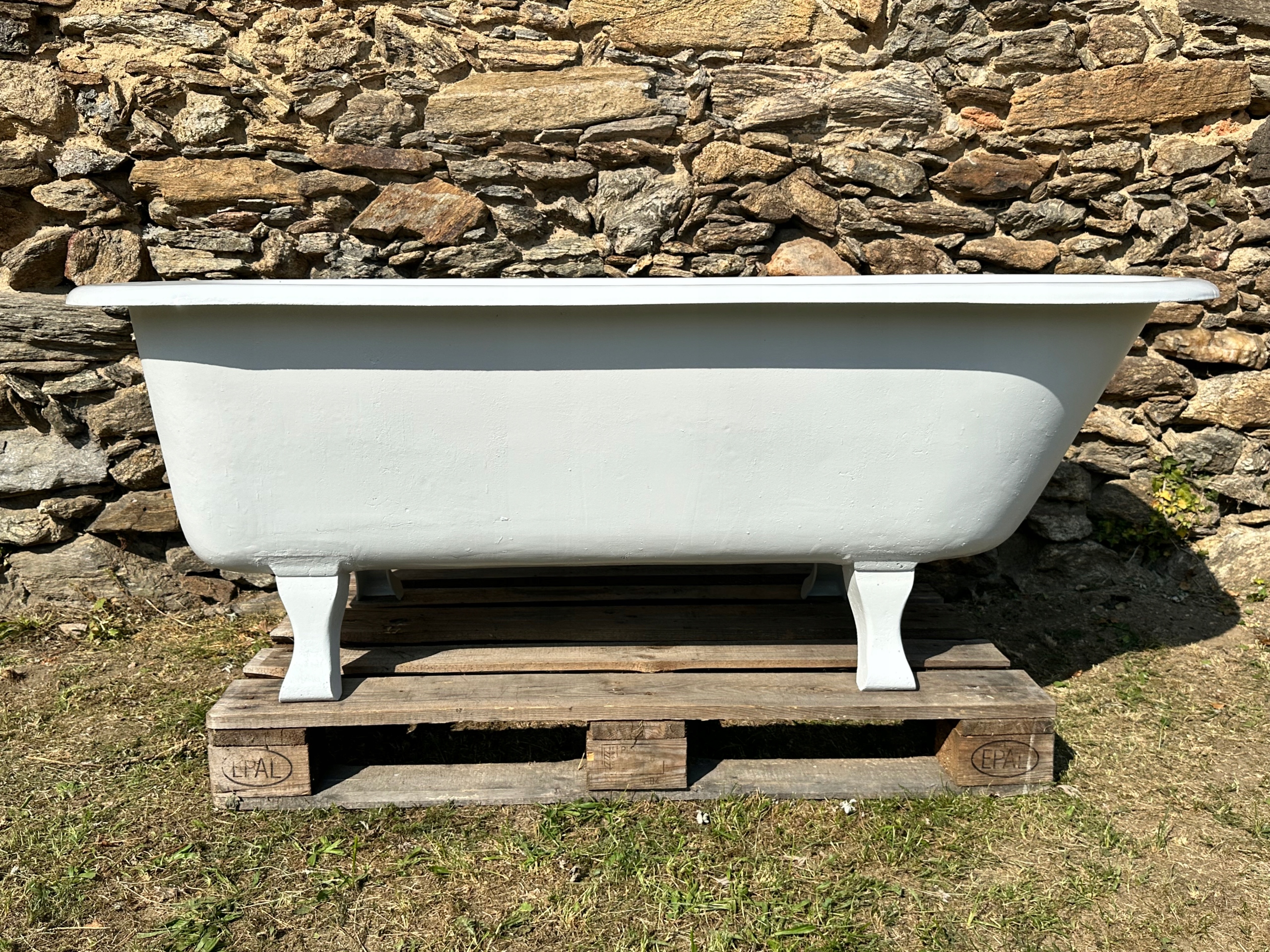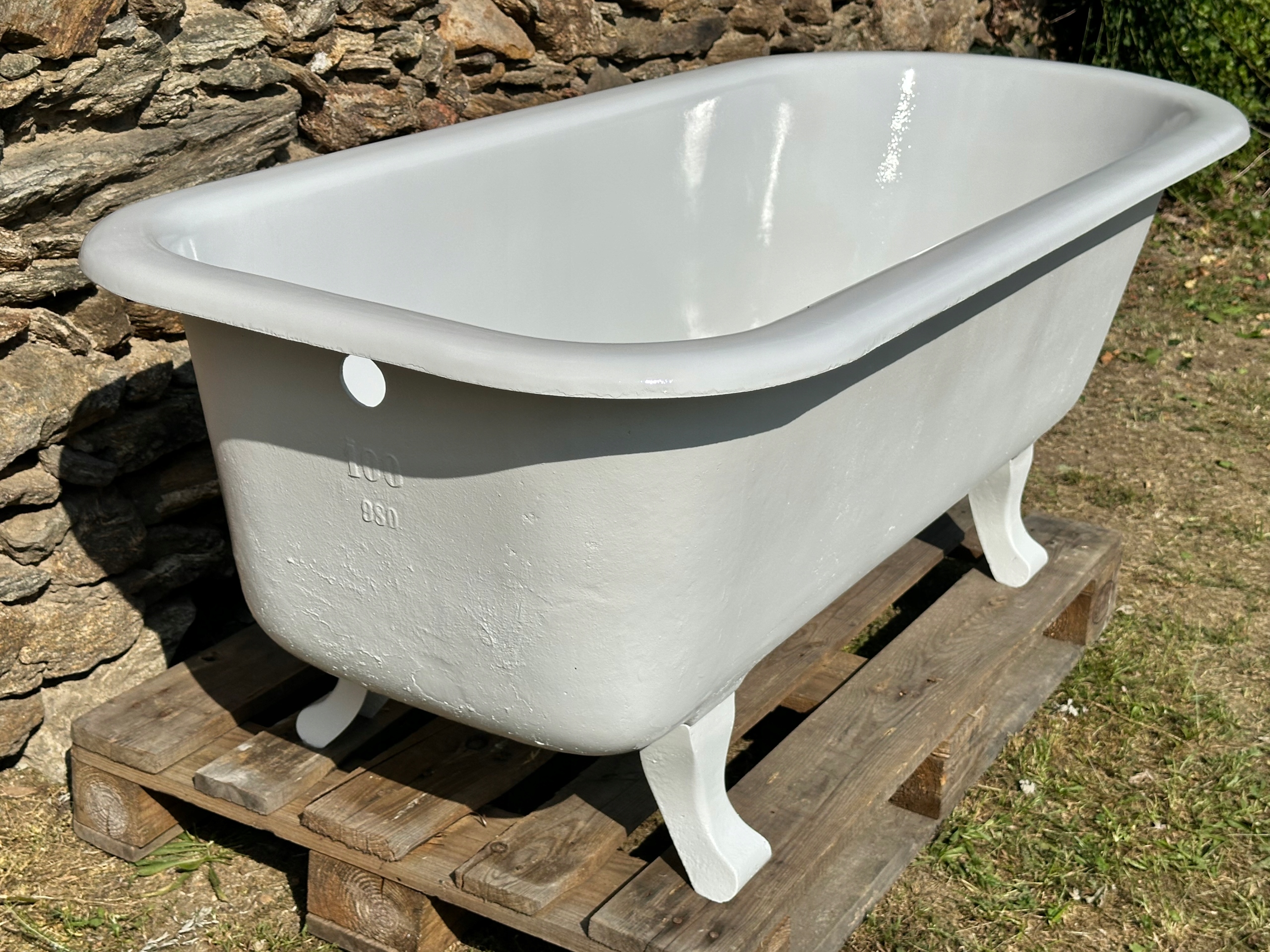 Предмет продажи — красивая, старинная, отдельно стоящая чугунная ванна довоенной эпохи. Уникальное изделие с красиво изогнутыми ножками. На спине надпись 100 980. Интересная модель с широким краем.