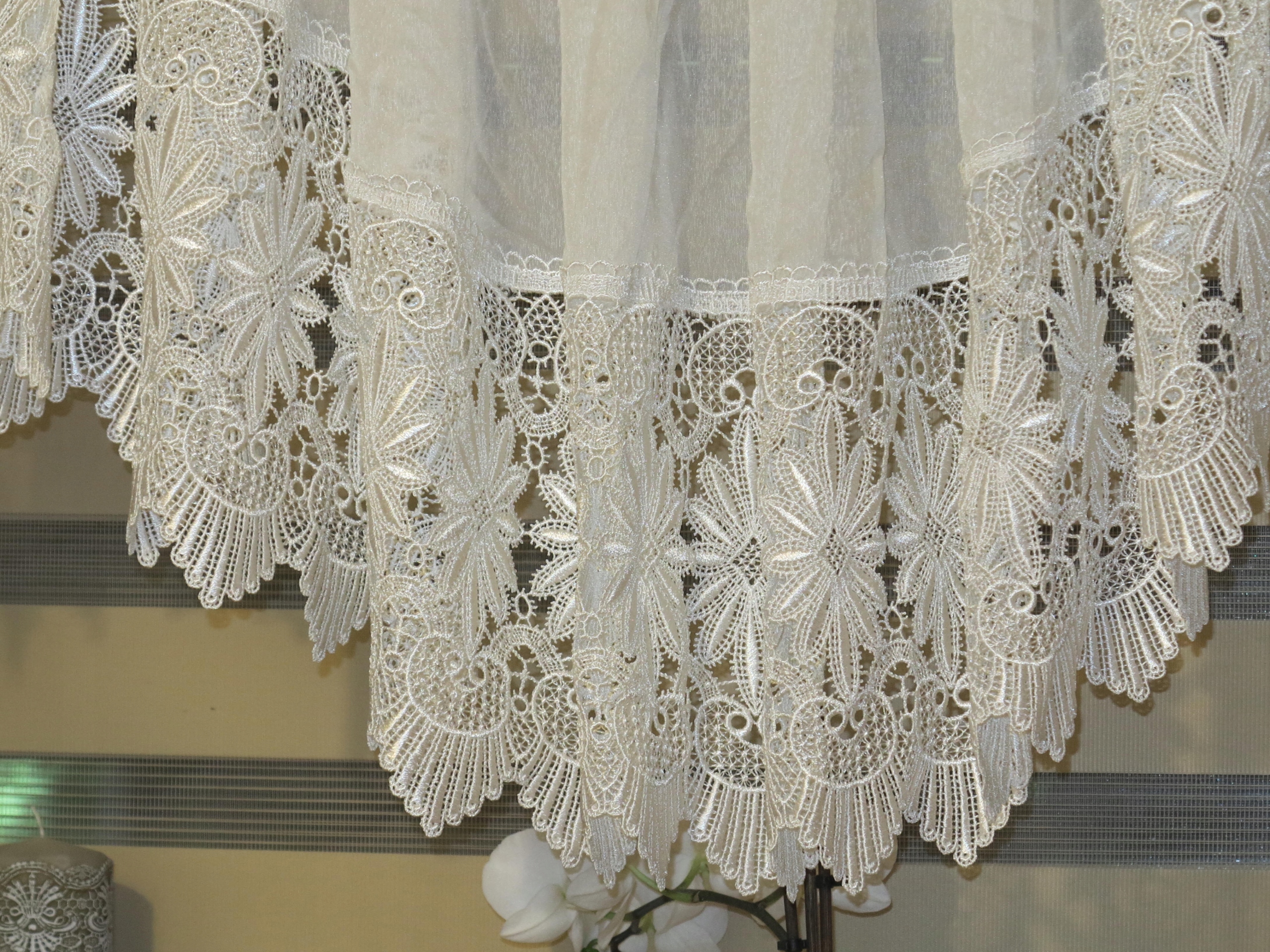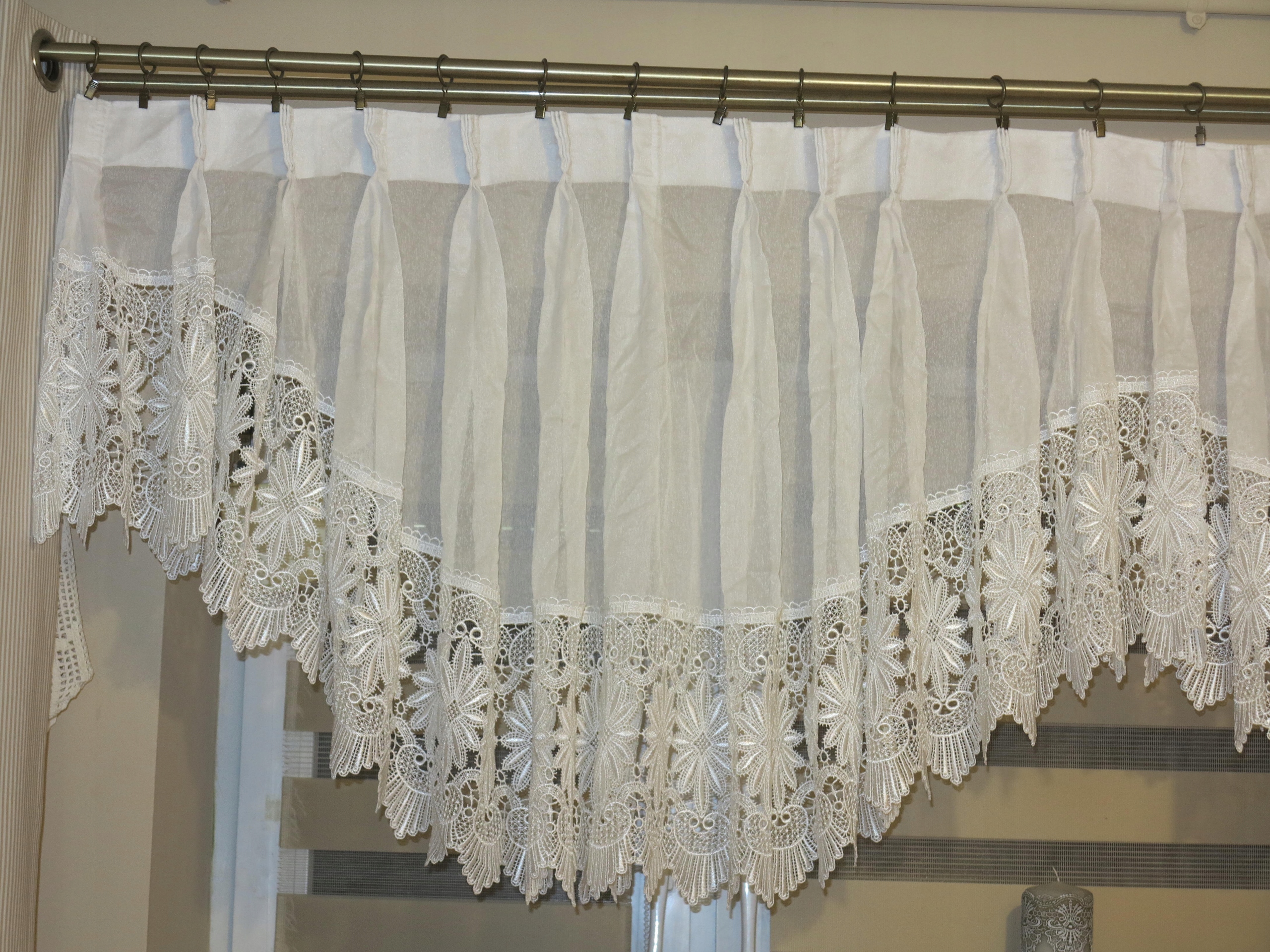КРАСИВУЮ БЕЛУЮ КОРОТКУЮ ШТОРУ, ДЕКОРАТИВНО ВЫРЕЗАННУЮ, С ТОЛСТЫМ И ШИРОКИМ ЖЕМЧУЖНЫМ ГИПЮРОМ ВНИЗУ. СТОРОНЫ НЕМНОГО КОРОЧЕ, ЦЕНТР НЕМНОГО ДЛИННЕЕ