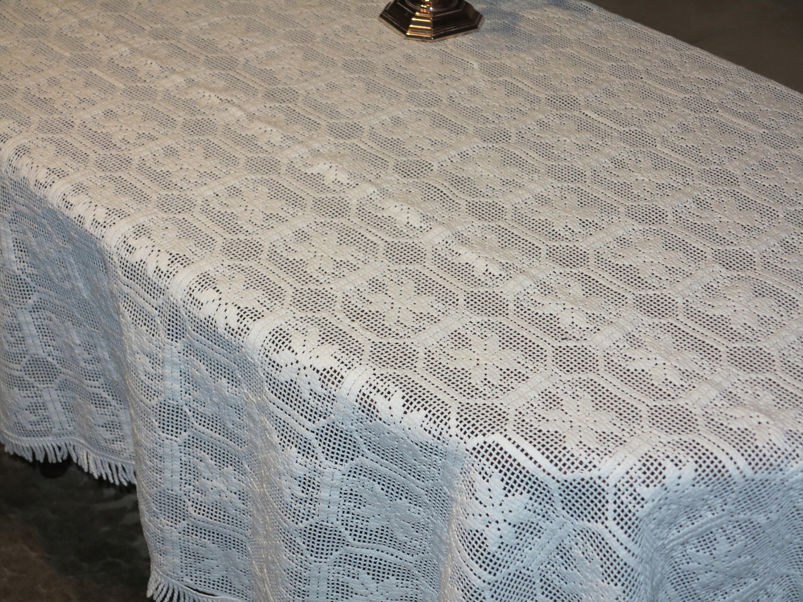 Предмет аукциона – необыкновенно красивая португальская скатерть из хлопкового кружева машинной выделки. , с примерно толстой бахромой. Красиво смотрится на столе. Его размеры: 174/120 см плюс бахрома. Скатерть б/у, но в очень хорошем состоянии и качестве. Рекомендую