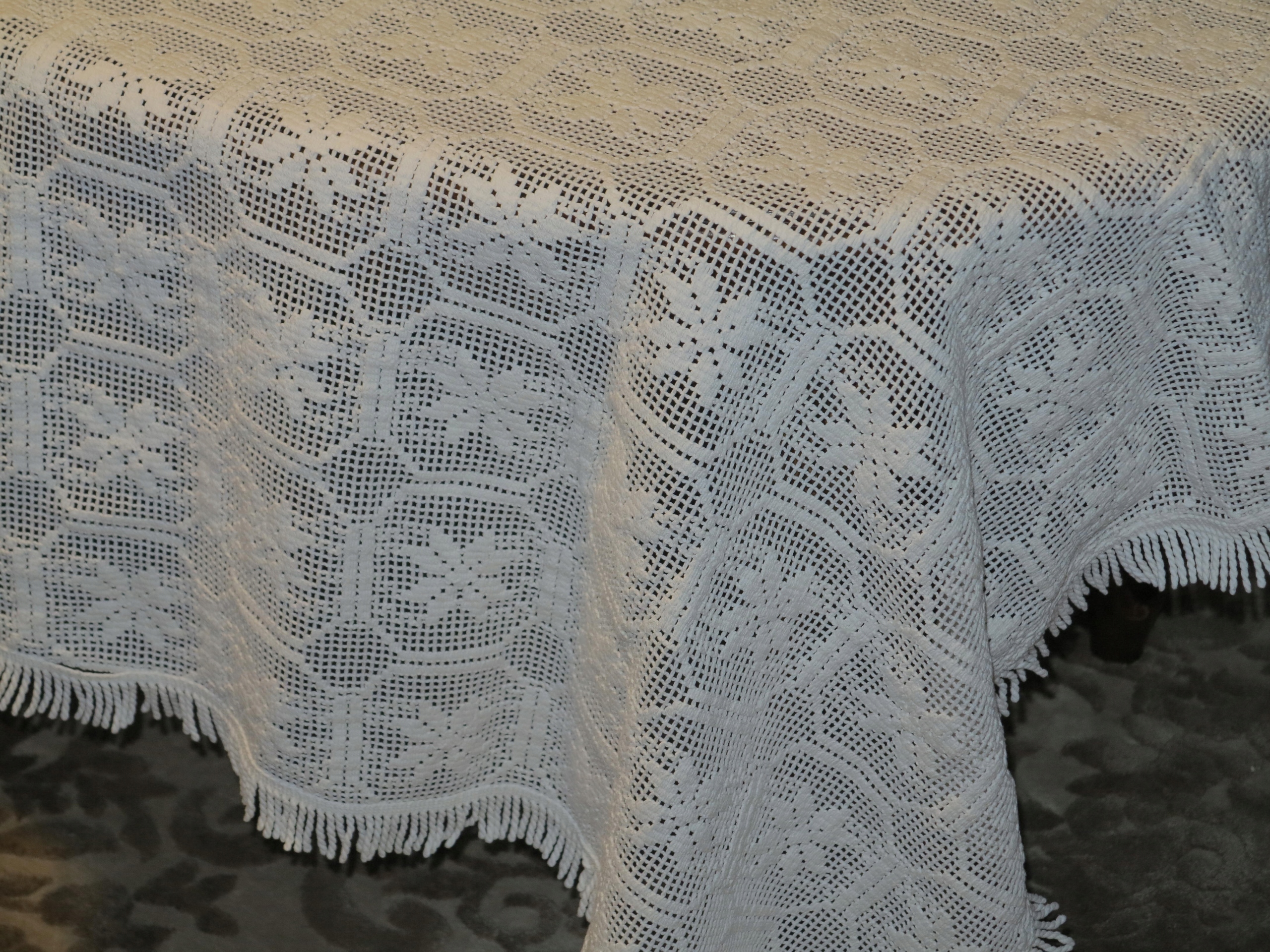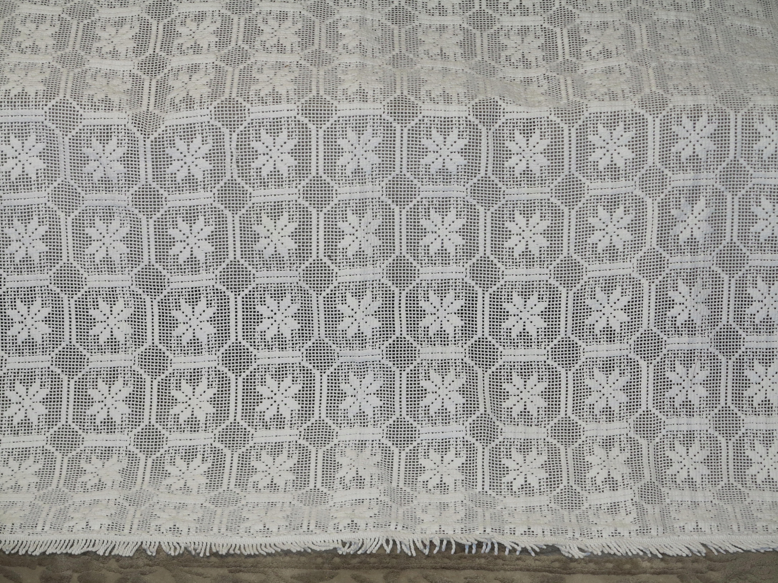 КРАСИВУЮ БЕЛУЮ СКАТЕРТЬ ИЗ ПЛОТНОГО ХЛОПКА МАШИННОГО КРУЖЕВА. ВЫГЛЯДИТ НА ВЯЗАНИЕ КРЮЧКОМ. ПО ВОКРУГУ ОТДЕЛЕНЫ ТОЛСТОЙ ХЛОПКОВОЙ БАХОРОЙ