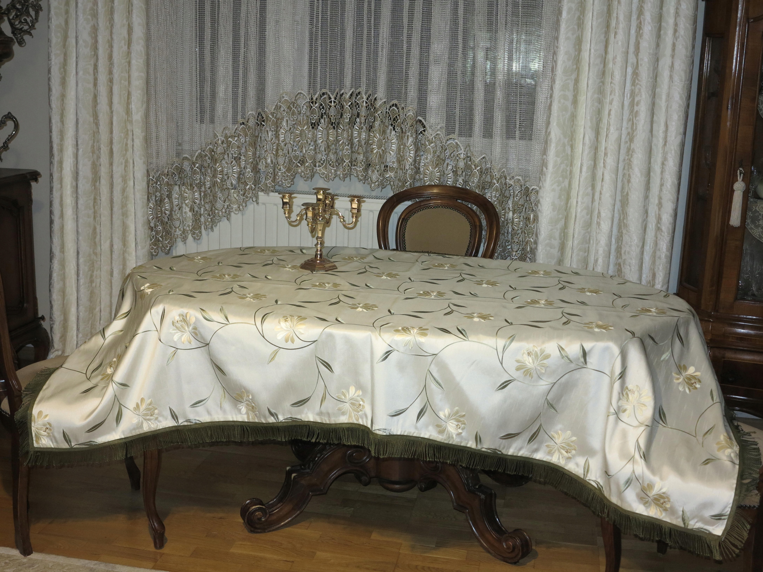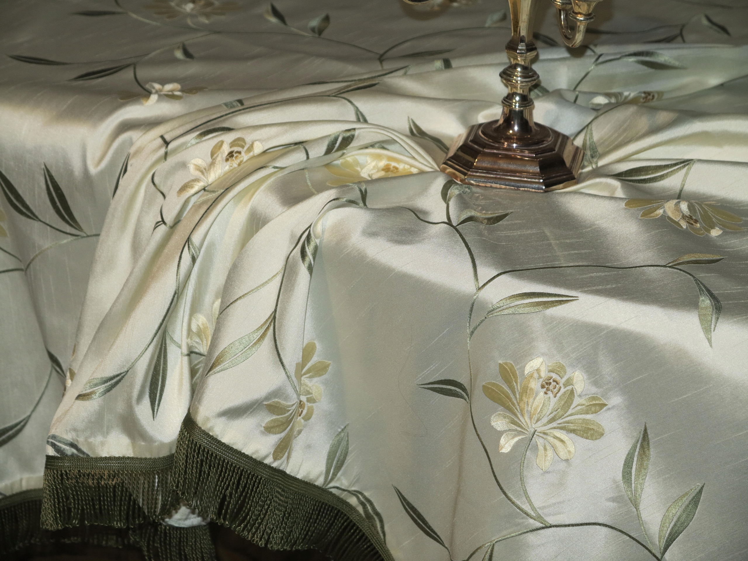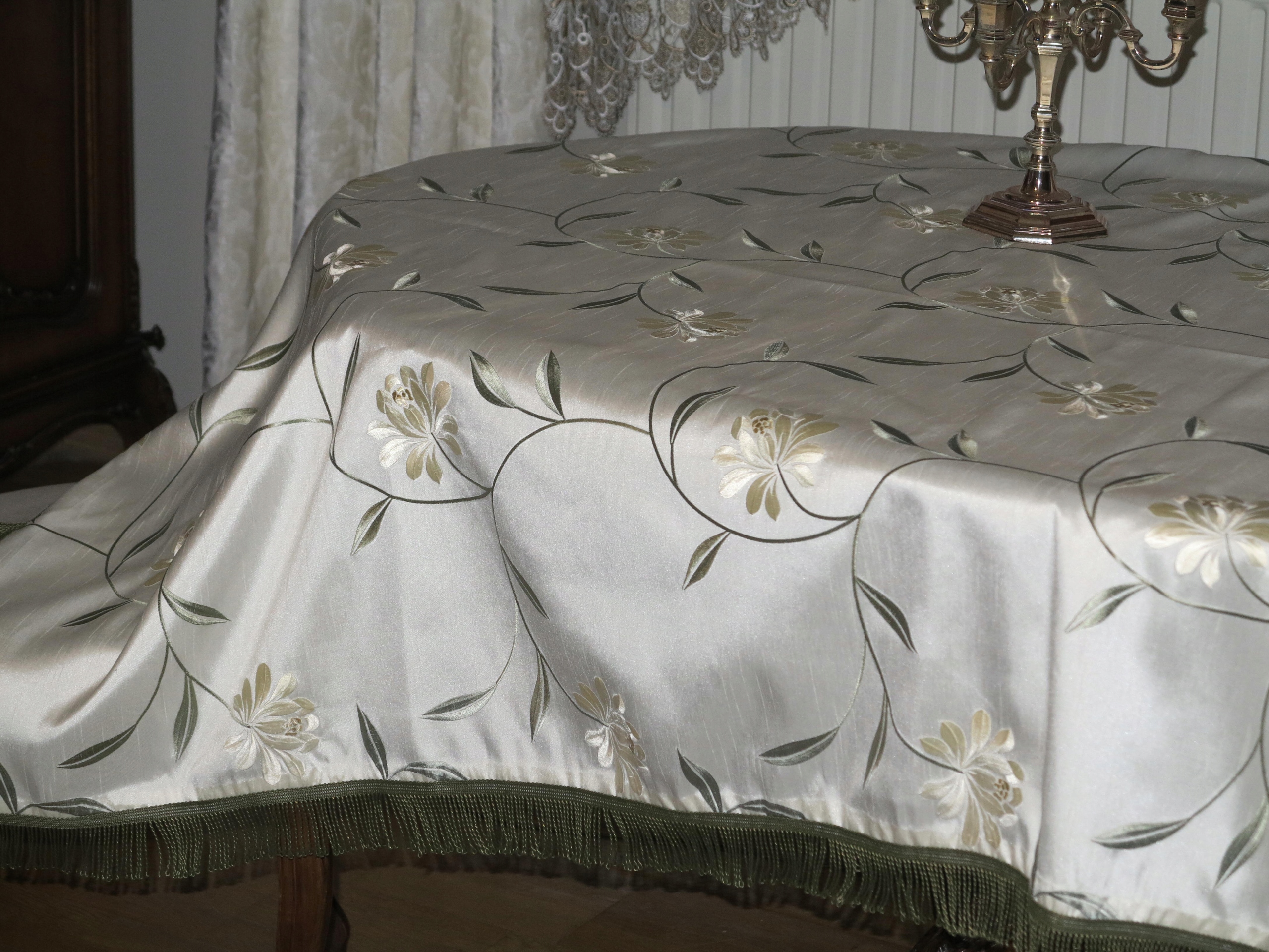 КРАСИВУЮ СКАТЕРТЬ ИЗ СИНТЕТИЧЕСКОГО ШЕЛКА, С БОГАТОЙ МАШИННОЙ ВЫШИВКОЙ. ВЫШИВКА ПРОИЗВОДИТСЯ С ОБЕИХ СТОРОН, СНИЖНЯ ВЫГЛЯДИТ ТАК ЖЕ, ЧТО НА ВЕРХНЕМ СЛОЕ. ФОНОВ ЖЕМЧУЖНО-ЭКрю