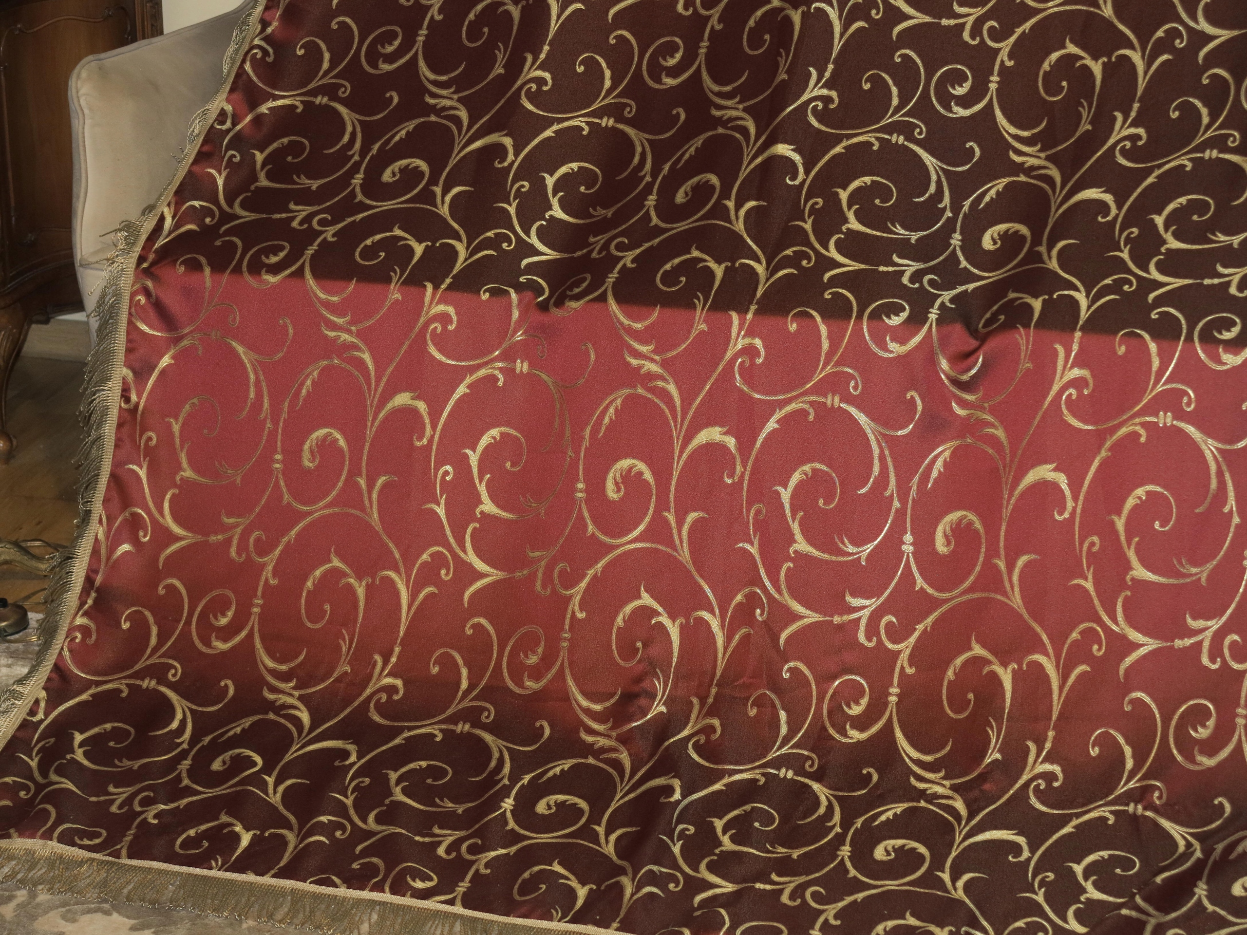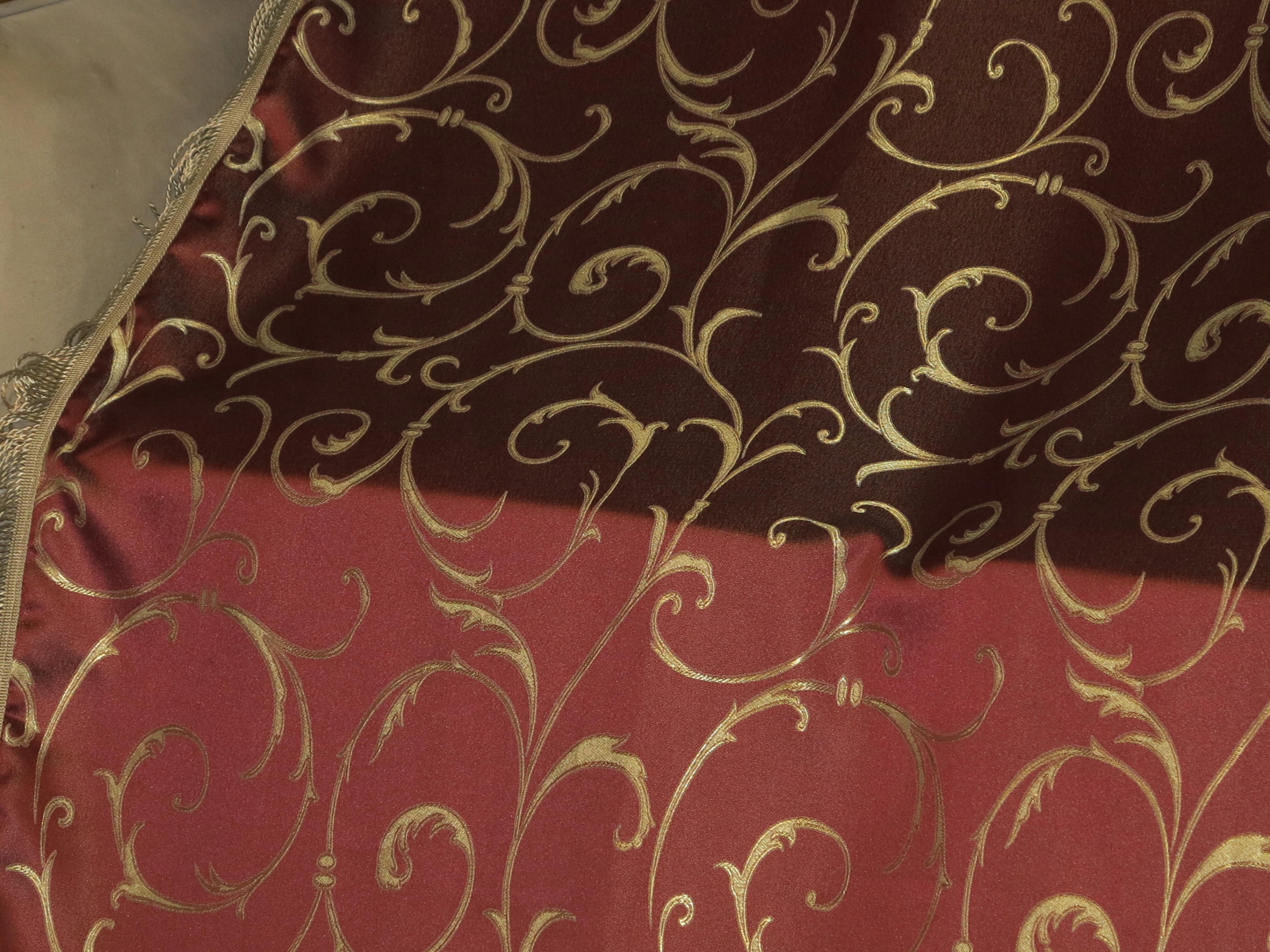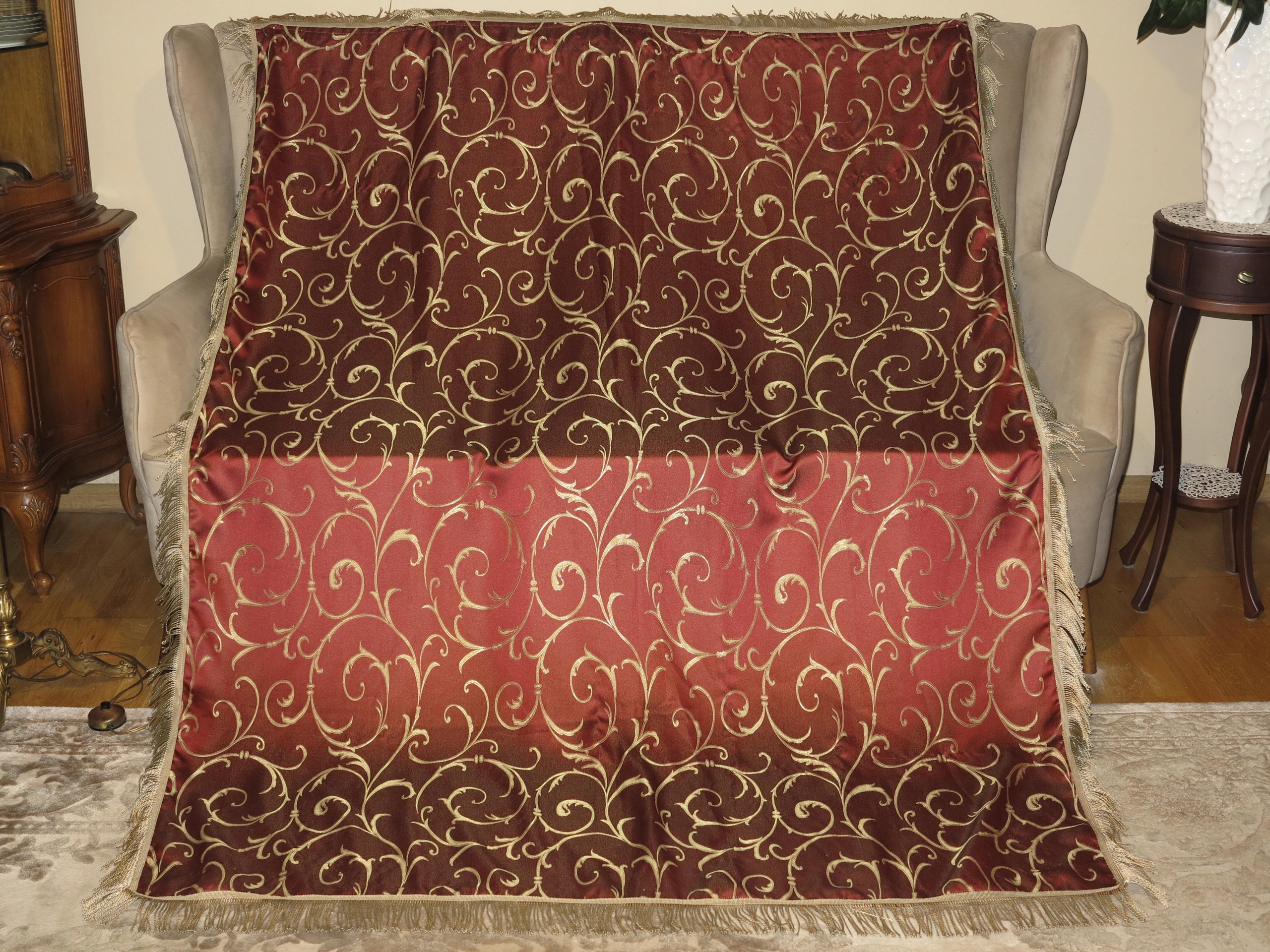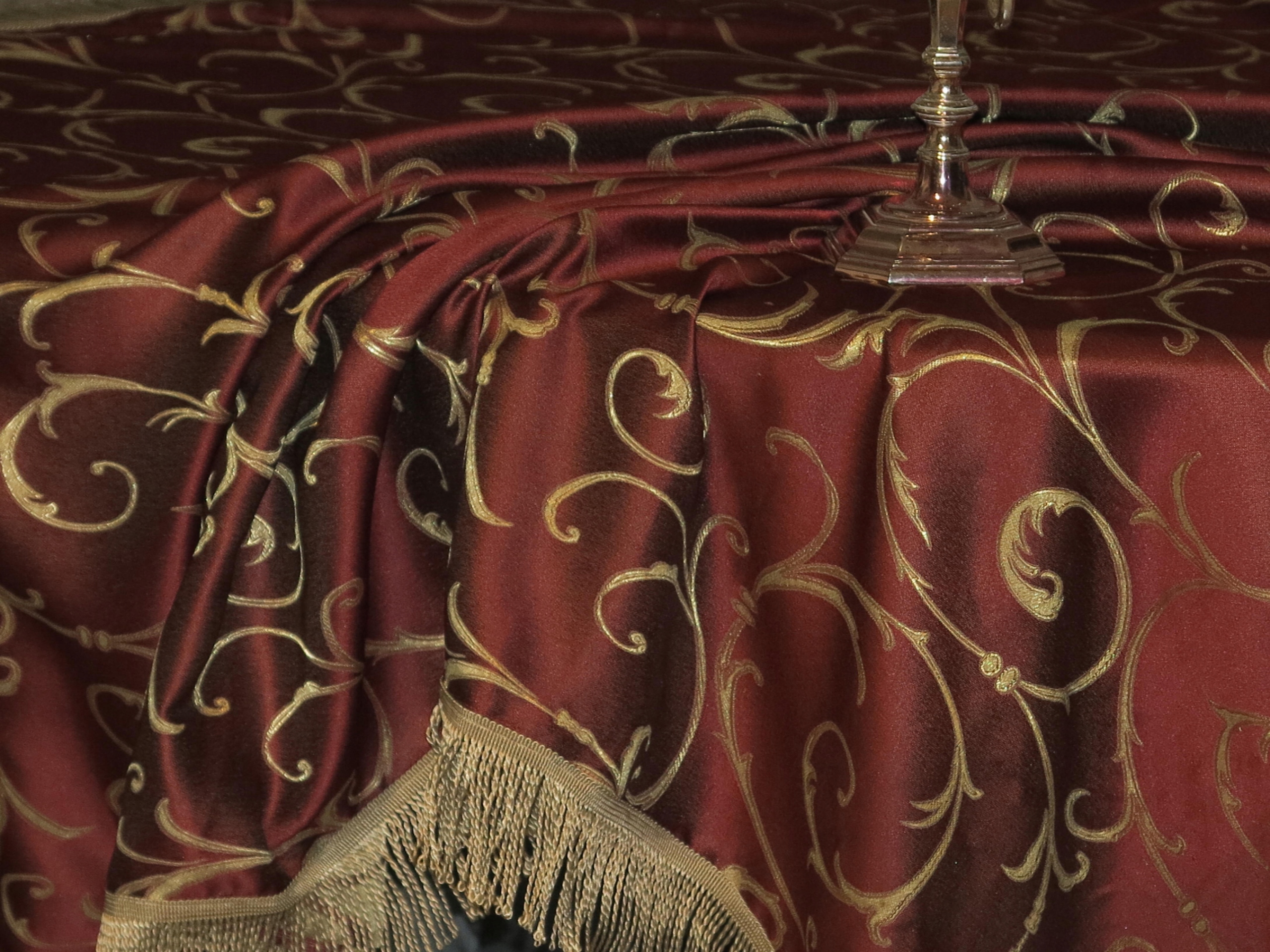 КРАСИВУЮ БОРДОВУЮ СКАТЕРТЬ СО СТИЛЬНЫМИ ЗОЛОТЫМИ УЗОРАМИ. ВОКРУГ УКРАШЕН ДЛИННОЙ ЗОЛОТОЙ БАХОЙ