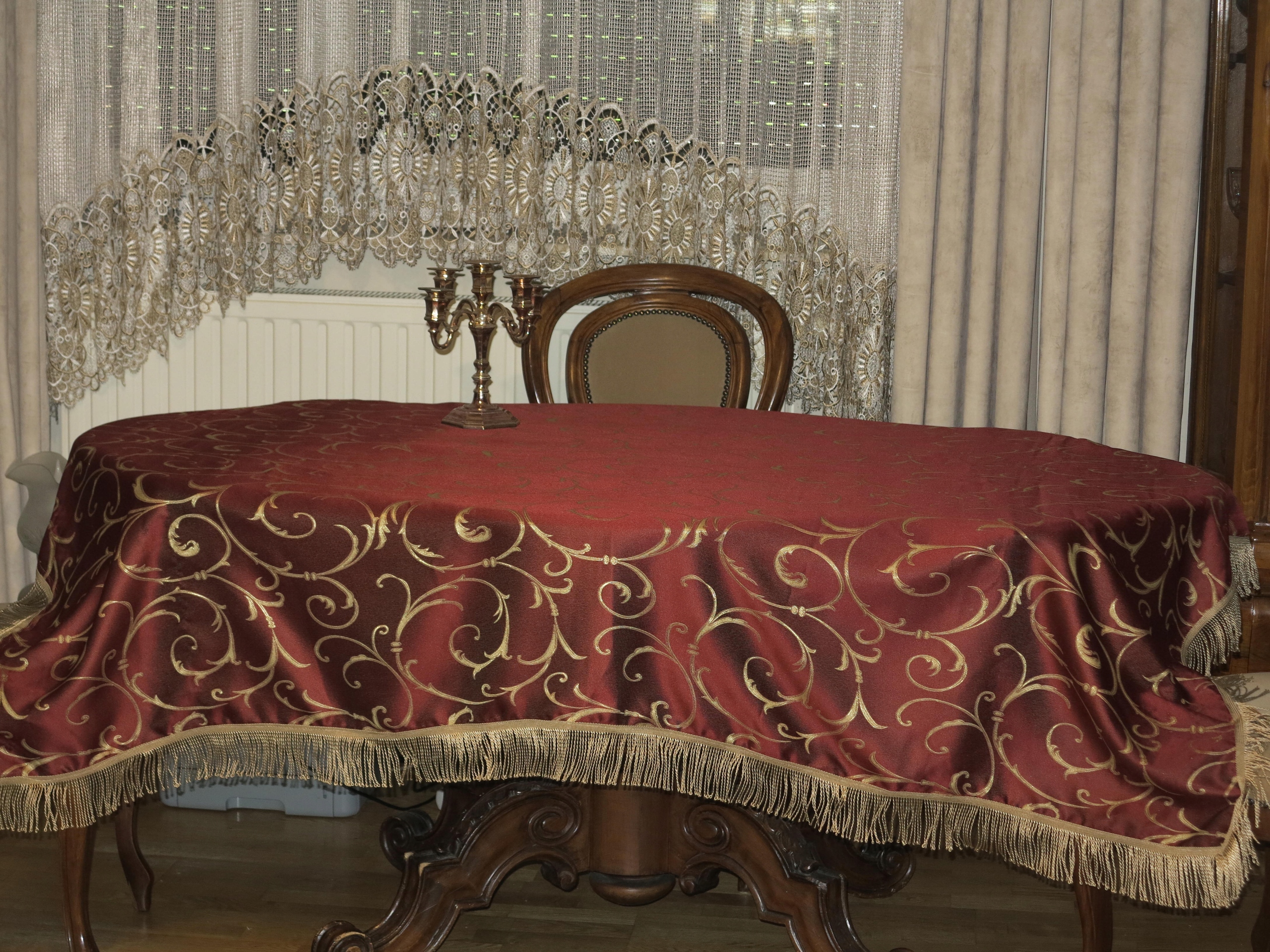 Предмет аукциона – красивая, стильная скатерть бордового цвета с золотыми узорами. Кругом золотая бахрома. Размеры скатерти: 190/142 см плюс бахрома примерно 7 см. Скатерть б/у, в очень хорошем состоянии. Рекомендую