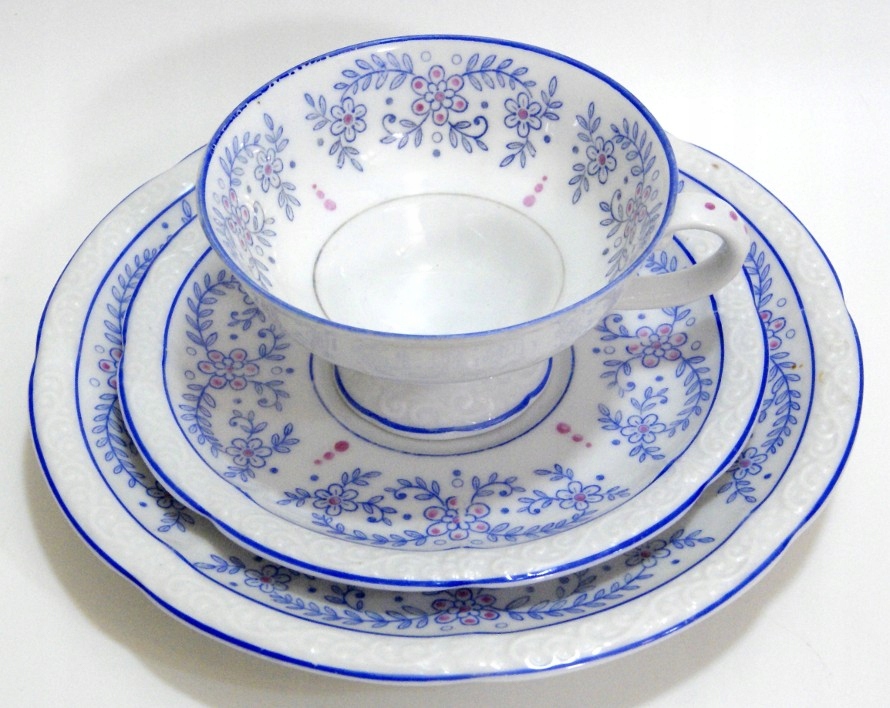 Красивый, старинный набор для завтрака, выполненный из белого фарфора, украшенный рельефом и голубыми цветами.