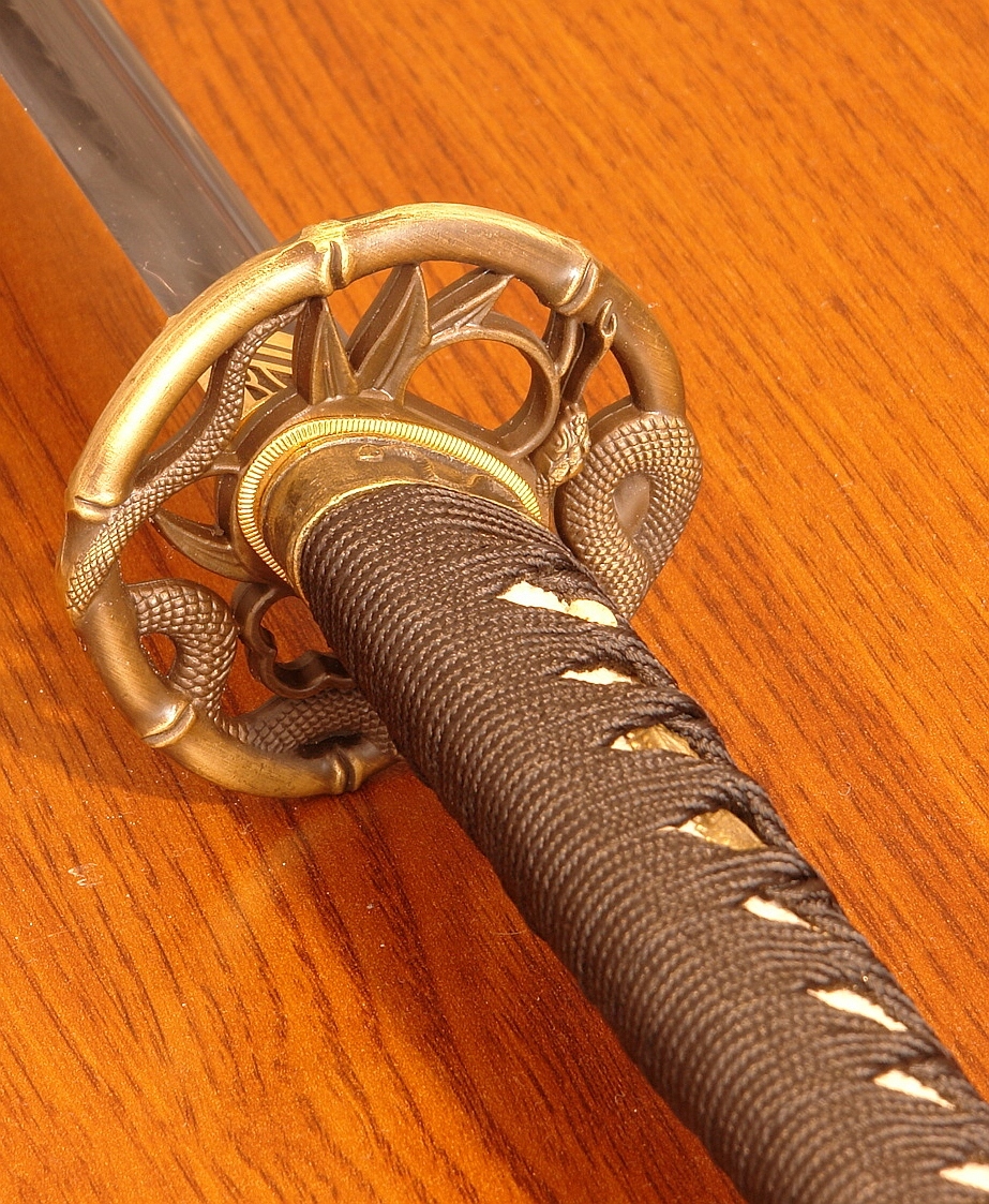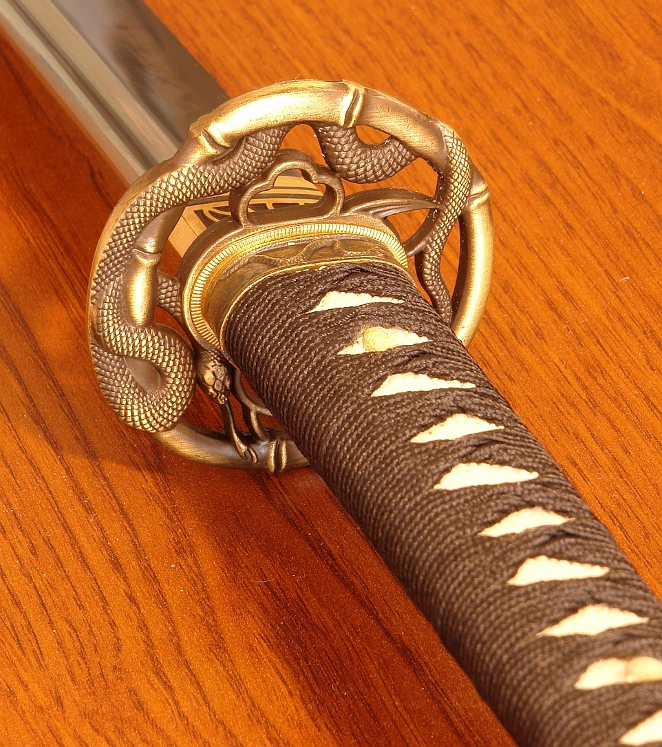 - Украшенное цевье (хабаки), цуба (гарда) с мотивом змеи, обвивающей бамбук, два меню и шайбы (сеппа) и остальная фурнитура изготовлены из латунного сплава - как на фото.