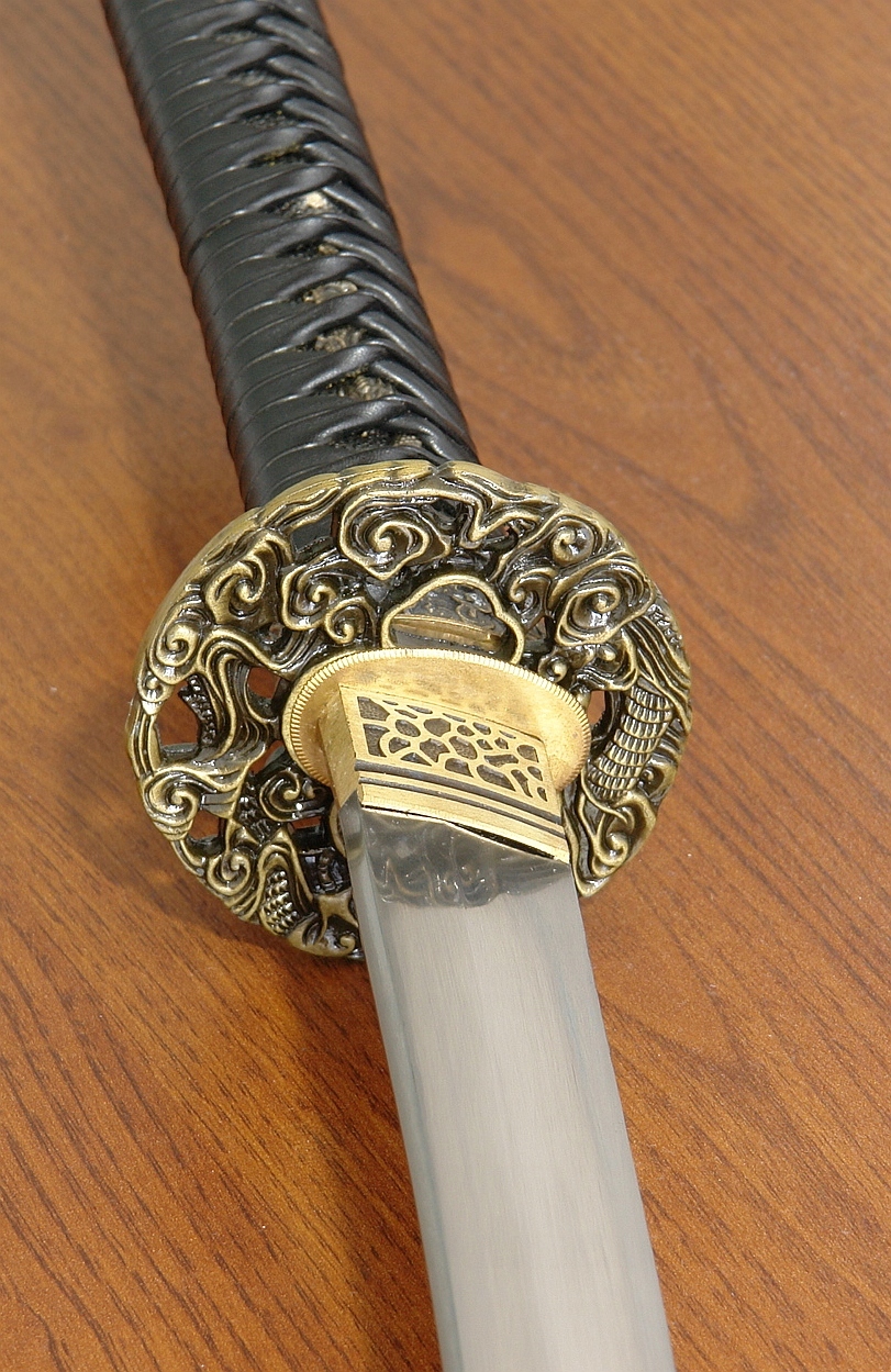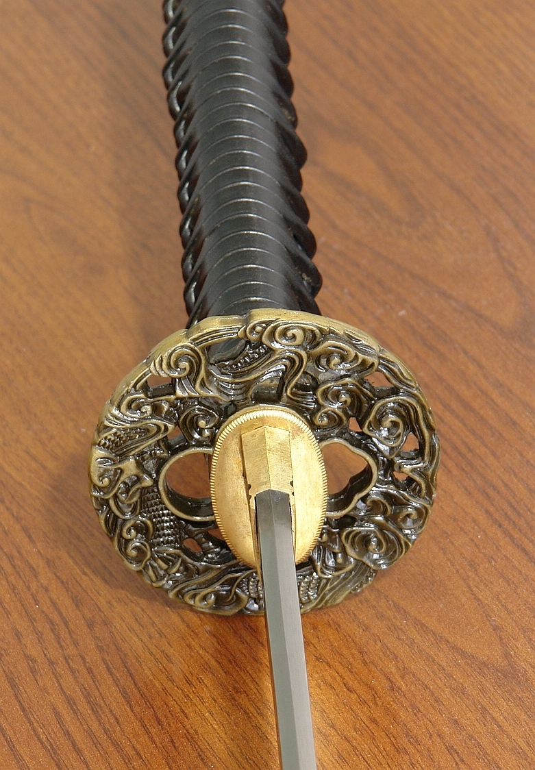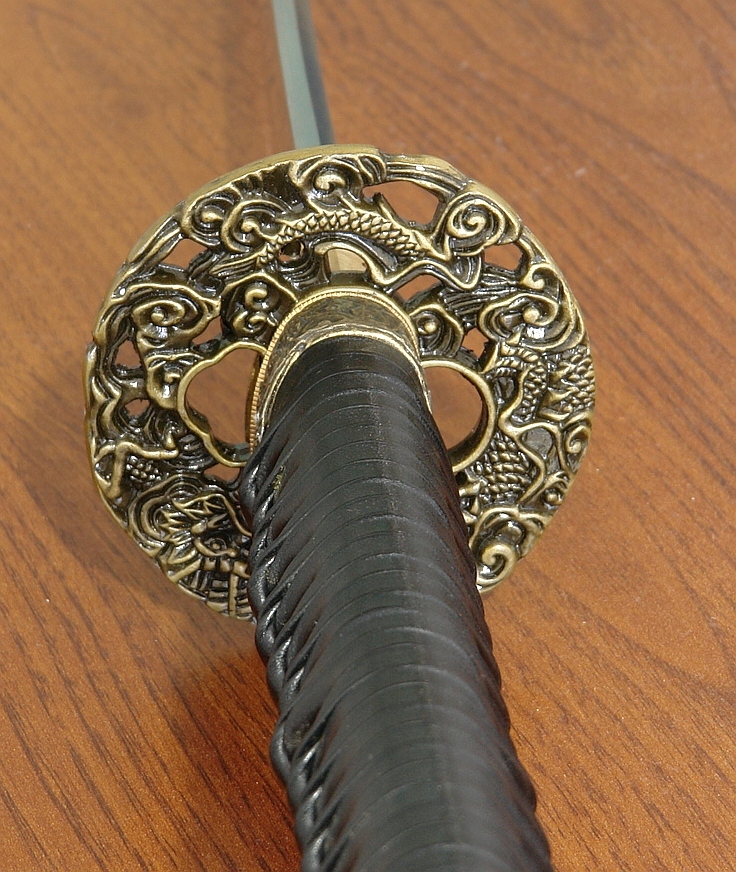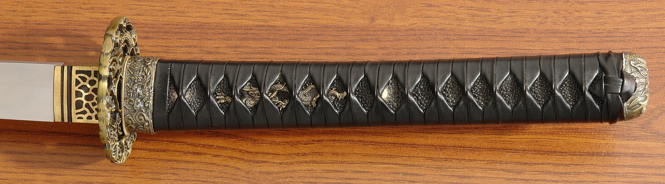 - Навершие (хабаки), цуба (гарда) с мотивом морского дракона, две менуки и шайбы (сеппа) изготовлен из латунного сплава - как на фото.